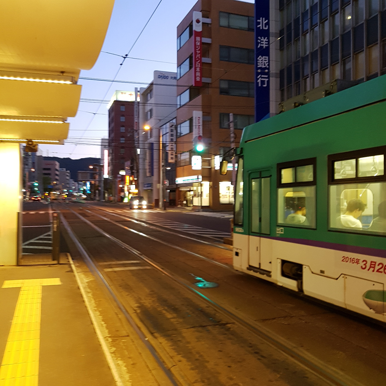 하코다테에 가면, 많은 명소가 있는 것은 아닙니다. 해가지고 어스름이 깔린 시점에 갔기 때문에 서둘러 숙소로 향했습니다. 숙소로 가는길인데 하코다테에도 노면 전차가 깔려있어 사진을 찍어보았네요.