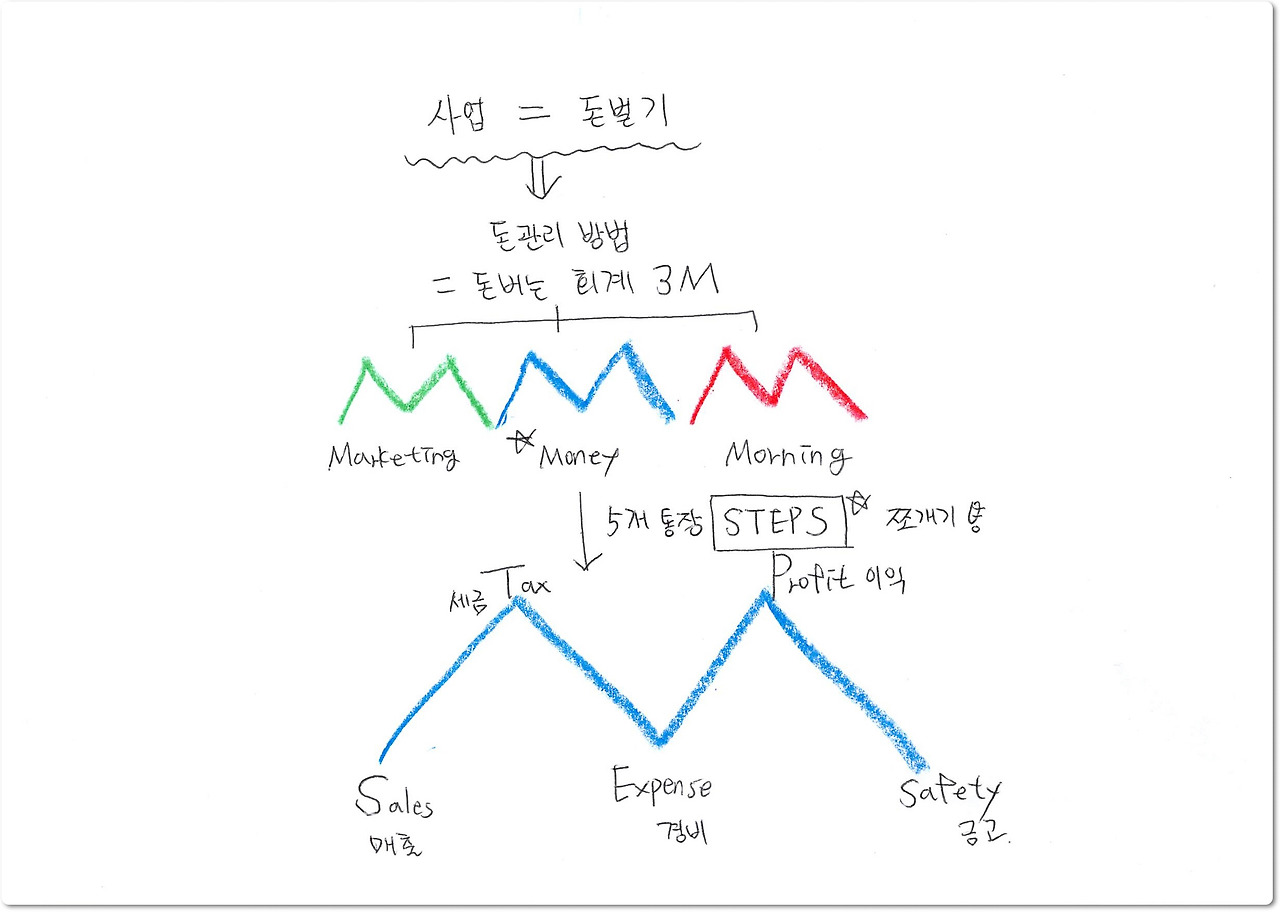 → 5개의 통장은 "STEPS : 매출(Sales), 세금(Tax), 경비(Expense), 이익(Profit), 금고(Safety)"통장이다.