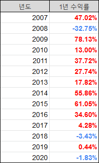 그렇다면 매년 어느 정도의 수익률이 나왔는지를 아래 도표를 살펴보겠습니다.