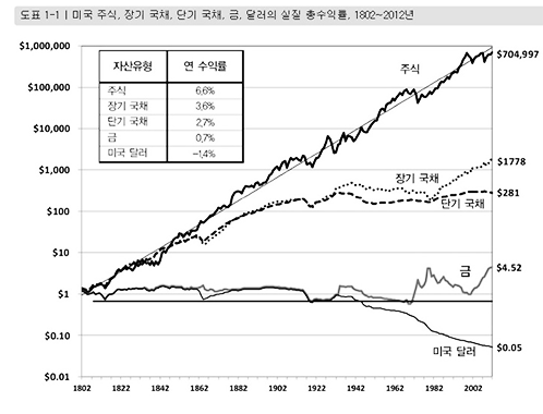 그러면 미국의 사례를 하나 보겠습니다. 아래는 주식에 '장기 투자하라' 책의 저자이자 펜실베이니아 대학교 와튼 경영대학원 교수로 재직 중인 제레미 시겔 박사님이 조사한 미국의 200년간 자산별 상승률로