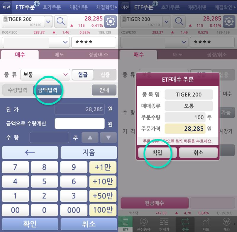 금액 입력 탭을 누르시면 수량을 계산할 필요도 없습니다. 투자할 금액 입력만으로 바로 그에 맞는 수량으로 계산됩니다.