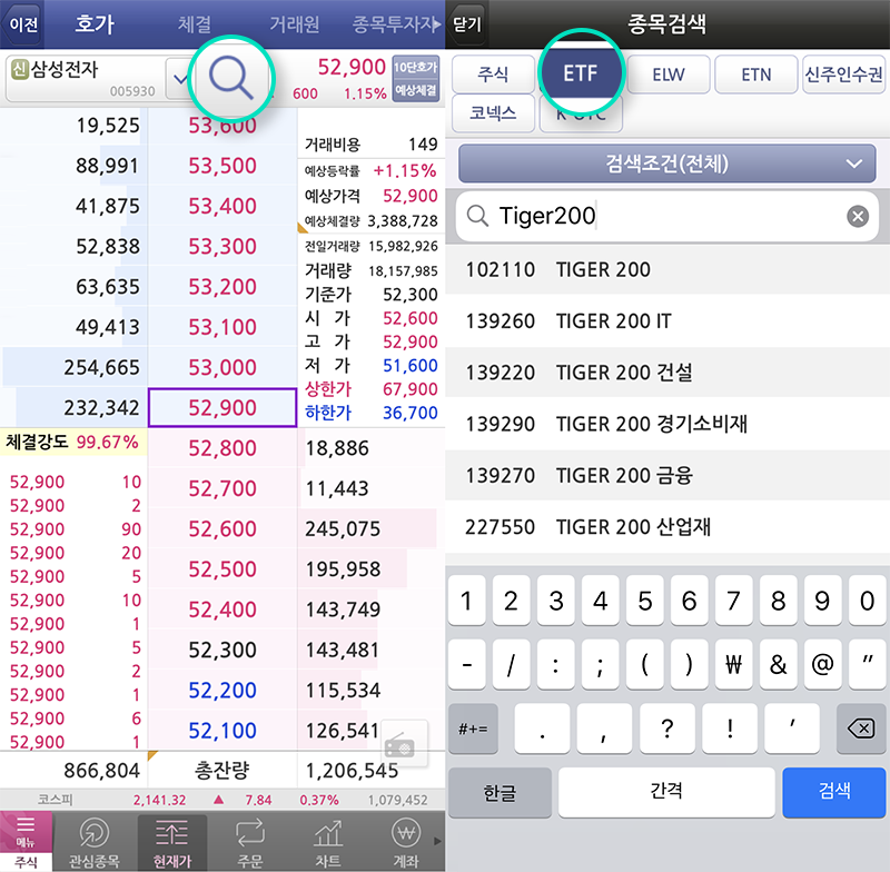 종목 검색(돋보기 아이콘)을 선택해볼까요? 종목검색 하단에 여러 메뉴가 있는데 이중 ETF를 클릭할게요.
