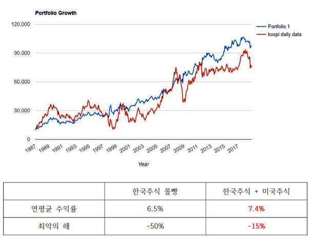 실제로 1987년부터 2017년까지 한국주식에만 투자한 것(빨간색)보다 한국주식과 미국채권을 반반씩 투자한(파란색) 포트폴리오가 훨씬 안정적이고 꾸준하게 수익을 내는 모습을 볼 수 있습니다.