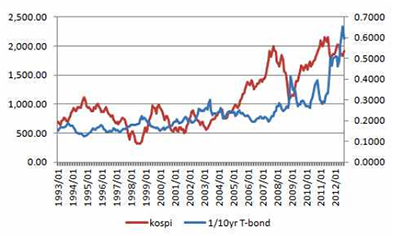 실제 위 차트를 보시면 한국주식(빨간색)과 미국 국채(파란색)가 서로 반대로 움직이는 모습을 볼 수 있습니다.