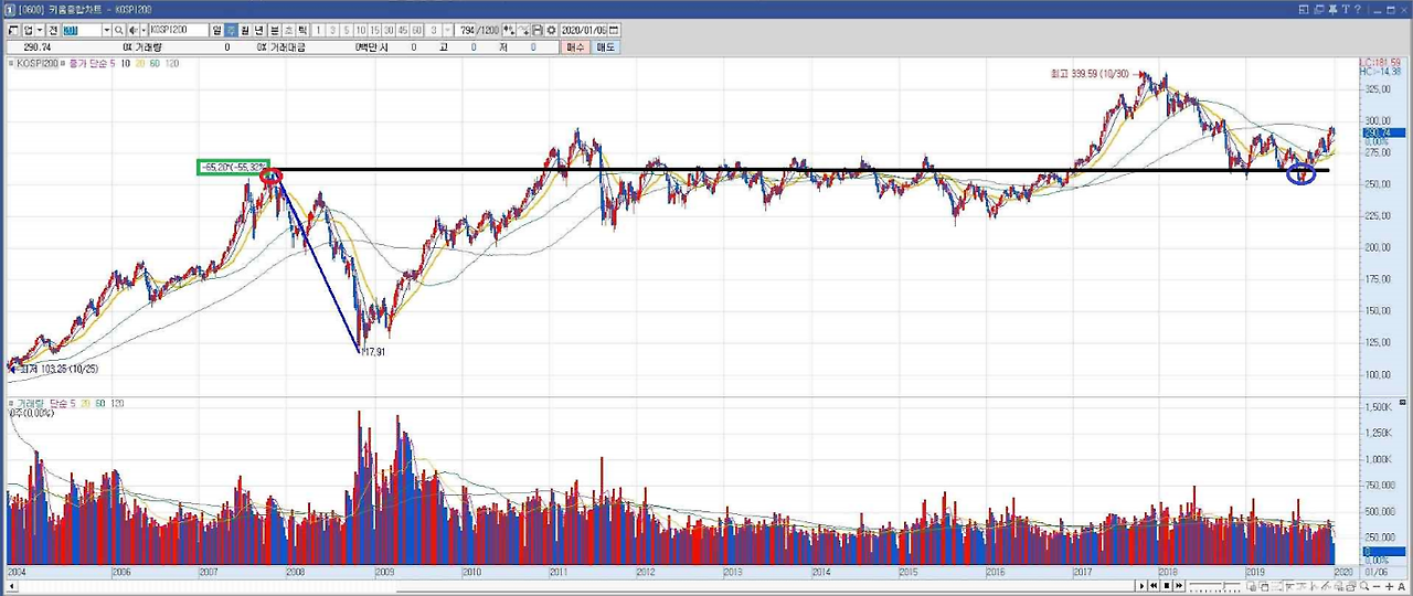 우리나라의 주식시장 차트입니다. 정말 운이 안 좋아서 2007년 말에 투자를 했다면 반 토막이 넘는 손실을 봤을 것이고 또한 2019년 말까지 약 13년간 장기투자했어도 수익률이 0%이었다는 사실입니다. 투자를 함에 있어서 이런 일이 앞으로도 없을까요? 절대 그렇지 않습니다. 하지만 이렇게 안 좋았던 기간이 존재함에도 불구하고 100년 넘게 어느 나라에서도 항상 주식이 장기적으로는 가장 수익률이 높았다는 것은 팩트입니다.