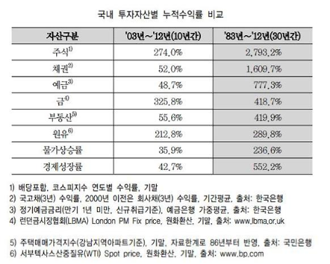 요약하면 우선은 장기적으로 우상향 하는 자산에 투자를 해야 하고, 그중에서도 장기 수익률이 높은 주식과 채권에 투자하는 것이 효율적임을 말씀드리고 싶습니다. 그리고 현금흐름을 창출할 수 있는 부동산 또한 좋은 투자자산입니다. 하지만 금은 현금흐름도 창출할 수 없고 물가상승률보다 약간 높은 정도의 수익률을 가져다주니 투자하더라도 전체 대비 작은 비중 내에서 분산 투자하심을 추천드리고 싶습니다.