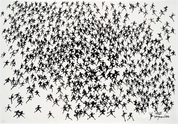 광주민주화운동의 소식은 파리에서 작업 중이던 77세 노장 화가의 귀에도 흘러들어 갑니다. 이내 그의 두 뺨 위에 멈출 수 없는 뜨거운 눈물이 흐릅니다. 이윽고 눈물을 닦고 일어선 그는 민족의 상징과도 같은 새하얀 한지를 (가능한 한) 거대하게 잘라 펼칩니다. 그리고는 깨끗한 먹이 물든 소박한 붓을 조용히 들어 터질 듯한 화상을 즉발적으로 뿌리기 시작합니다. 그렇게 <군상> 연작이 태어납니다.