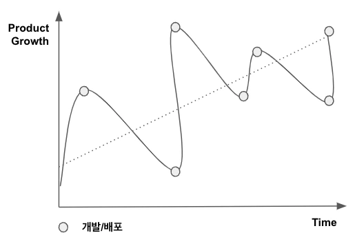 A/B 테스트를 통한 제품개발은 대규모 개발 및 배포와 대비하여 더 작은 단위로 개발/배포와 각 배포에 대한 지속적인 테스트(검증)을 의미합니다. 이는 대규모 개발 및 배포 대비 동일 시간에 구현 할 수 있는 개발의 양의 감소로 이어집니다. 하지만, 대규모 배포 이후 해당 배포의 성적이 예상했던 것과 달라 비즈니스에 안 좋은 영향을 준다거나 최악의 경우 roll-back을 해야 하는 상황 (또는 상황의 크기)는 줄어듭니다. 즉, 각 개발/배포 Cycle에서 기대할 수 있는 return 값과 return의 변동성 (standard deviation)이 모두 제한적이 되는 거죠. 기업마다 차이는 있겠지만 제품의 성장 cycle을 일반화를 하면 아래와 같은 그래프로 표현이 될 수 있습니다.