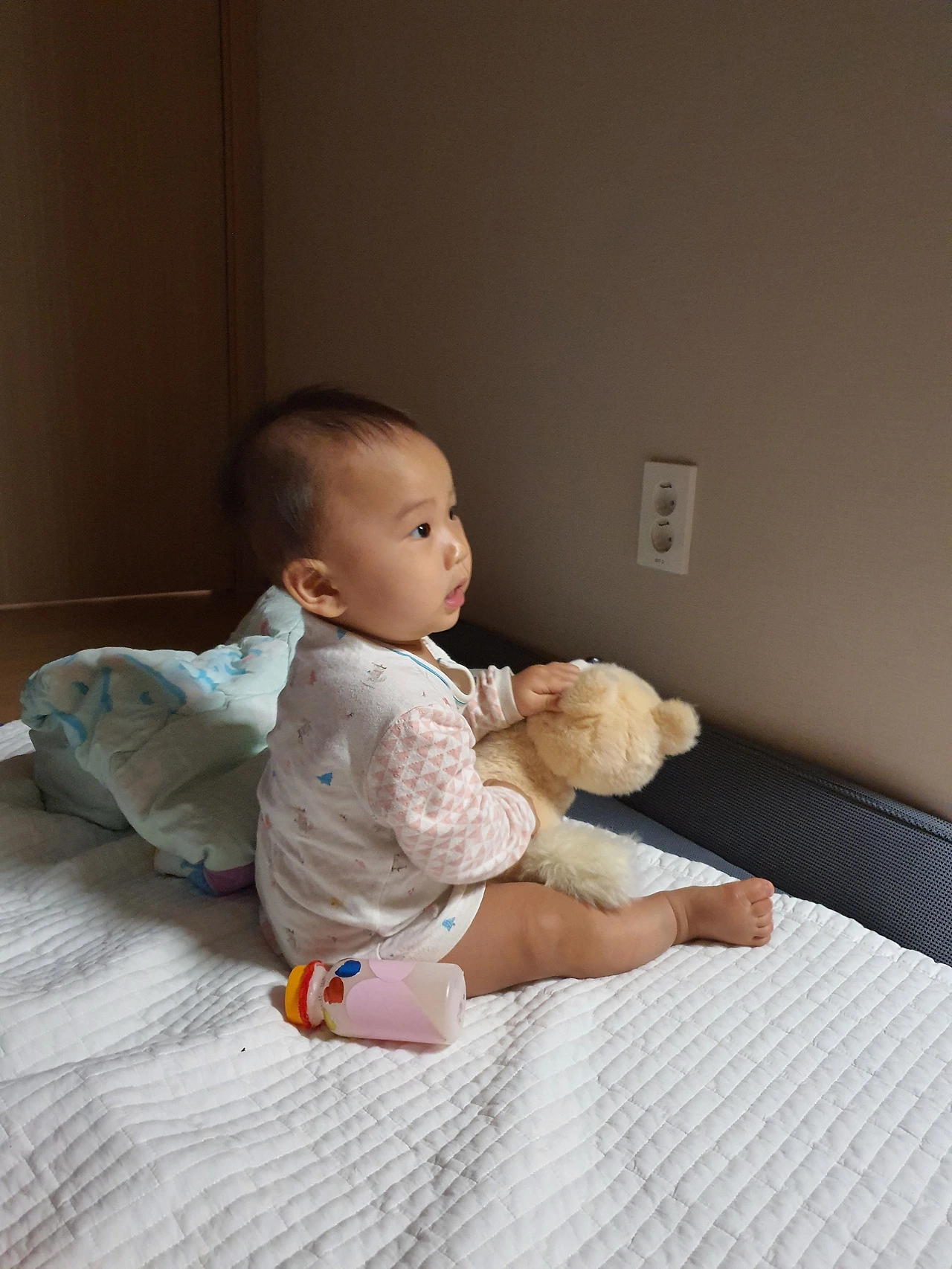 오늘 둘째도 큰 발전을 했다. 짚고 일어서더니 오늘은 문 옆에 손을 짚고는 허공에 3초 정도 그대로 제자리에서 일어서있는 상태를 유지했다. 말을 못하는 둘째도 표정으로 나에게 말을 걸어보였다. "엄마, 내가 해냈어! 내가 스스로 일어서있었다고! 봤지?"