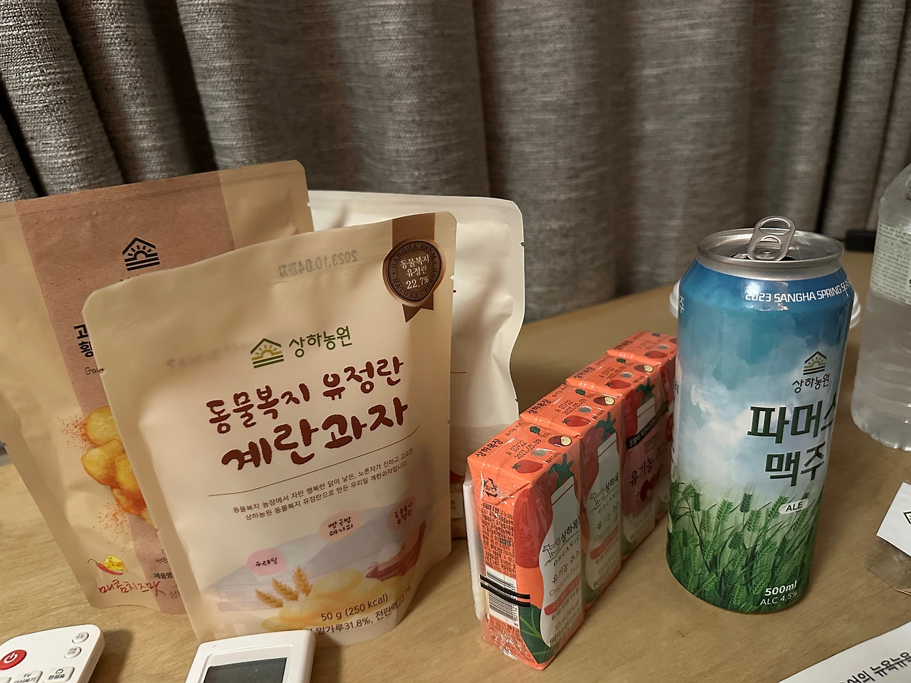 홀로 객실로 돌아와 상하목장 굿즈를 흐뭇하게 바라보며 맥주 캔을 똑딱! 평상시에 비싸서 손이 가질 않던 상하농장 유기농 먹거리들이 이렇게 사랑스러울 수가 없다.