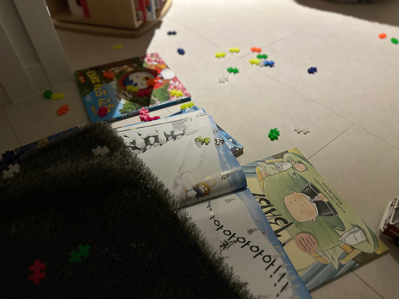 종일 공원에서 축구랠리를 펼친 형아는 씻을 엄두도 못낸 채 책을 읽다가 엎어져 잠들었다. 형아를 샤워시켜 눕히고 “이젠 육퇴구나”하며 방으로 들어왔다. 잠시 의자에 앉아 한숨 돌리려는 찰나, 3살 꼬마는 책장 위로 손을 뻗어 리본을 잡아 당겼고 통 속에서 블럭들이 차라락 경쾌하게 쏟아진다.