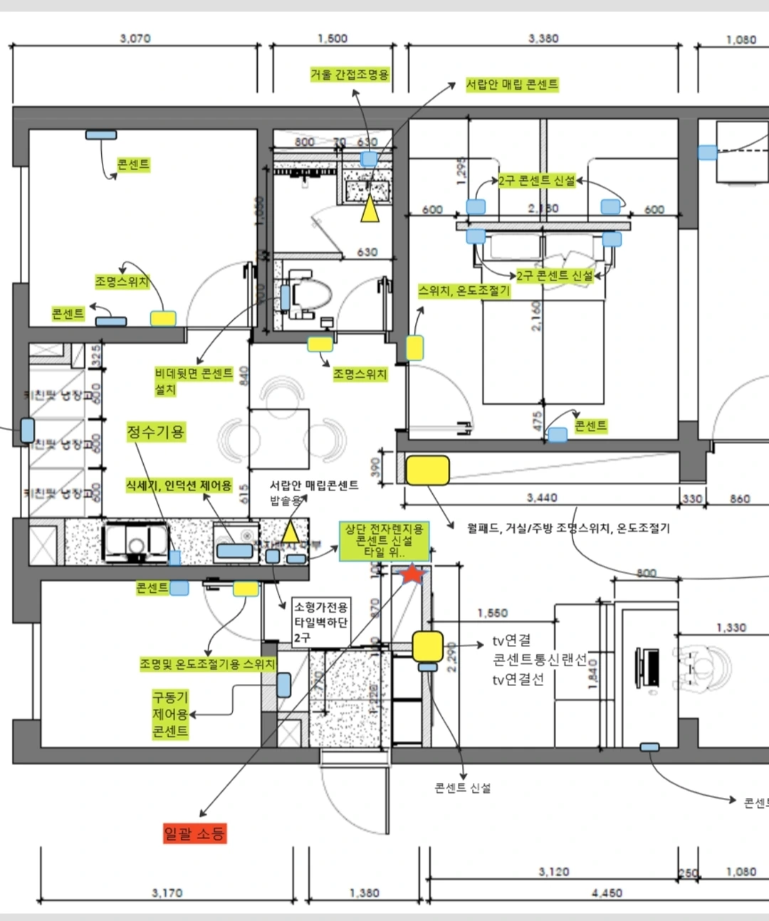그 말은 스위치, 콘센트, 인터넷 등등 모든 전기의 위치와 갯수가 이미 계산이 되어있어야 한다는 말이다.