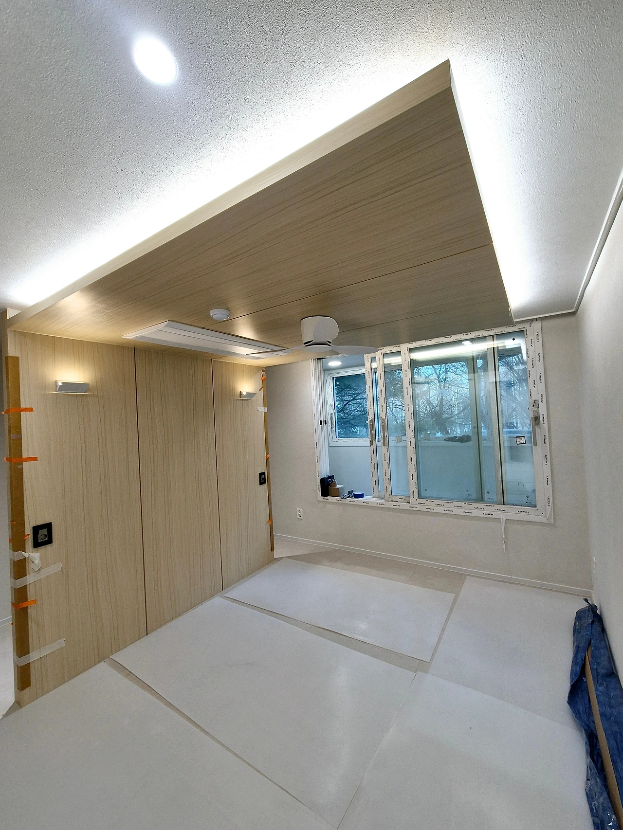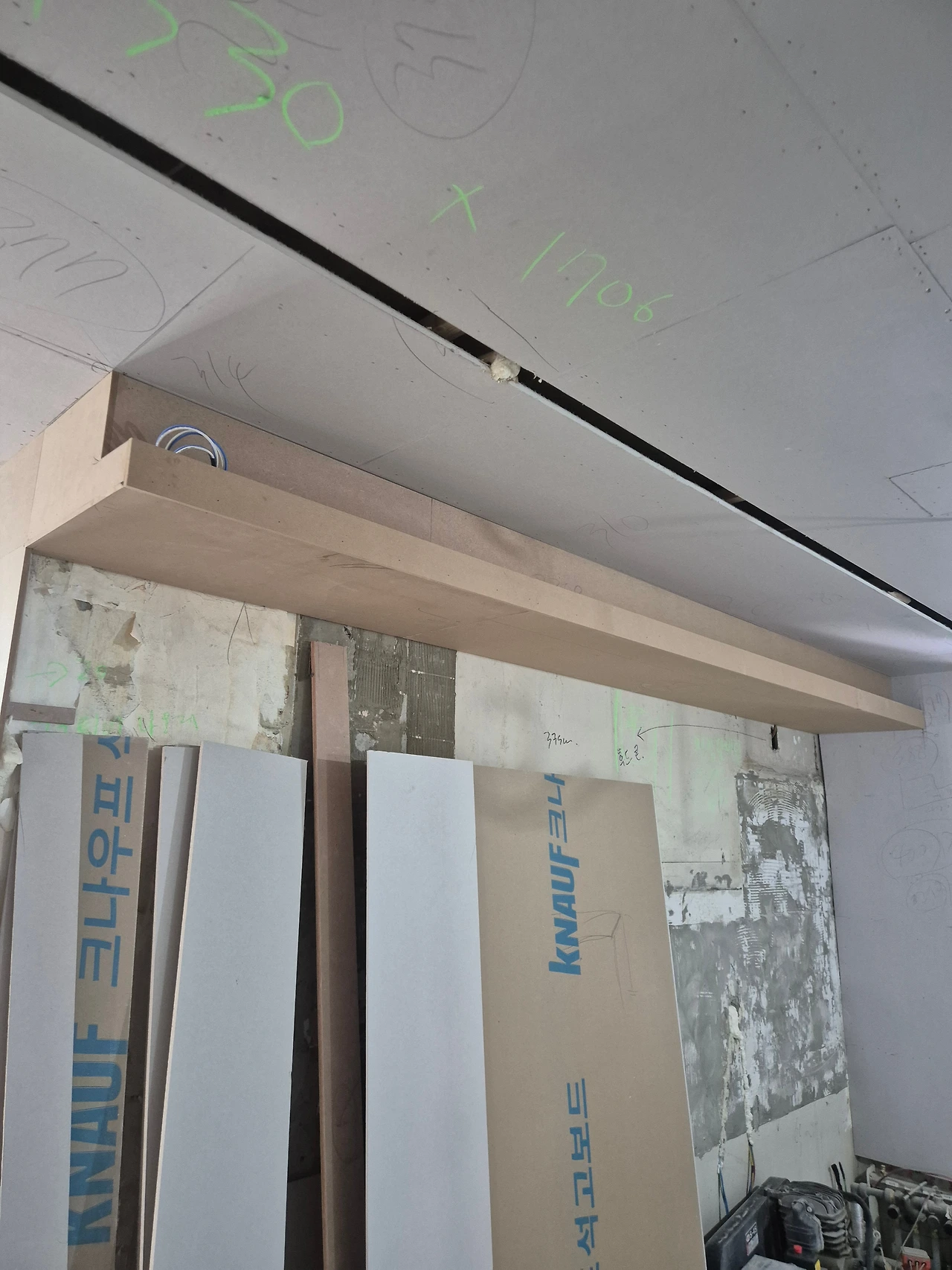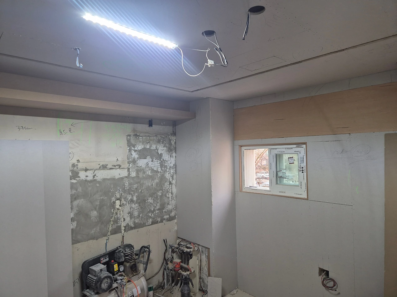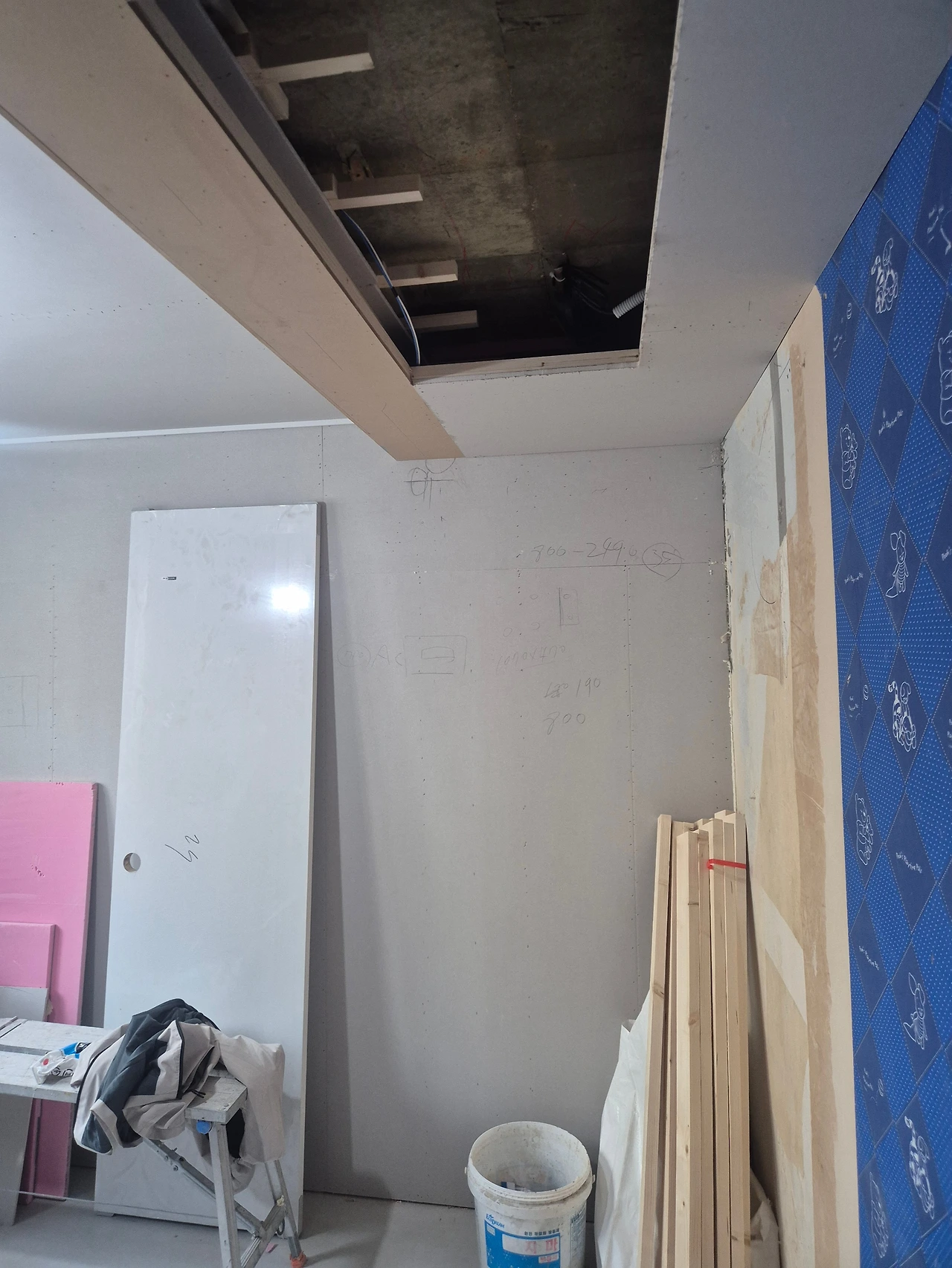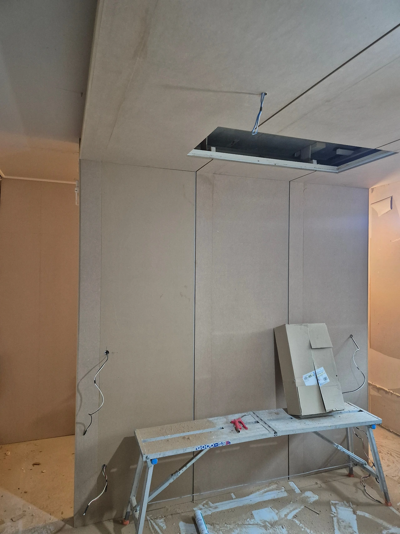 단열 후, 석고보드 마감. 에어컨 박스가 만들어진 모습.