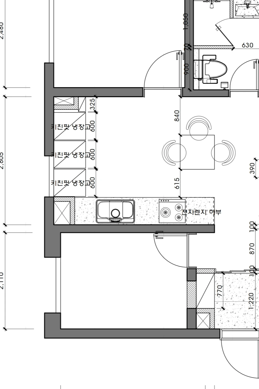 냉장고 사이즈를 위해 최소 1800 이상이 확보되어야 하는데, 그게 너무 타이트해서 모험을 좀 했다.