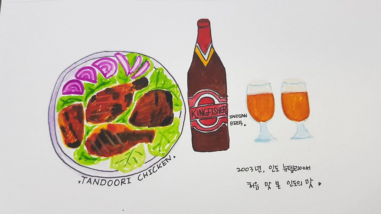 아무것도 먹지 못하는 우리 사정을 말하자 언니는 우리가 좋아할 만한 음식이 있다면서 우리를 한 식당으로 인도했지요. 언니가 우리에게 소개한 음식은 바로바로 탄두리 치킨! 적색양파와 상추가 깔려있는 접시에 가지런히 놓인 탄두리 치킨은 정말 그 빛깔도 예술이었어요. 그 맛 또한 예술이었지요. 태어나서 먹어본 닭요리 중에 최고였어요. 게다가 언니는 탄두리에 곁들여 마실 킹피셔 맥주도 추천해주었어요. 저는 사실 술은 잘 못 먹지만, 아... 정말 좋았답니다.