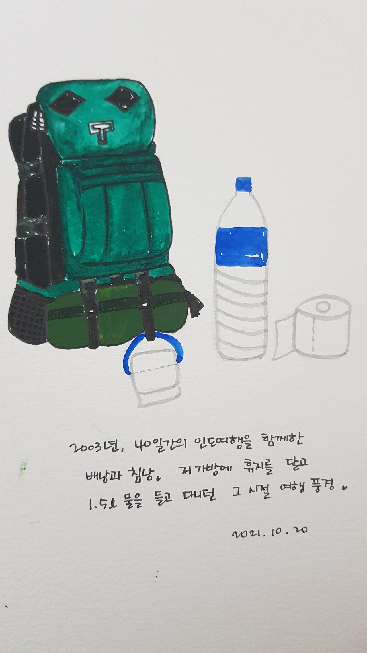 지금 생각하니 그 모습이 좀 우습네요. 당시 저와 친구는 가방에 침낭 하나씩 달고, 화장지 달고, 1.5리터 페트병 물을 돌아가면서 들고 다녔어요. 500미리는 비싸고, 금방 다 먹으니까요.
