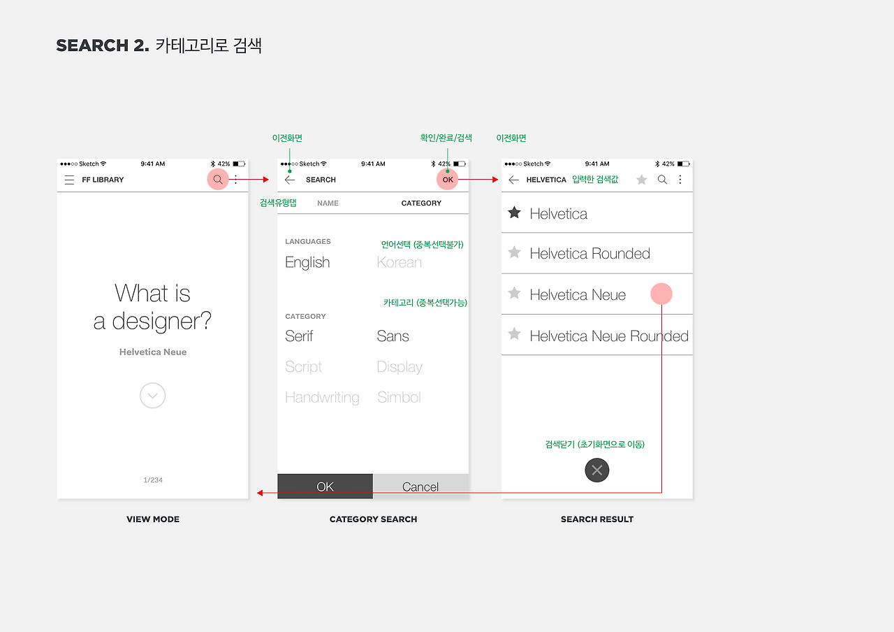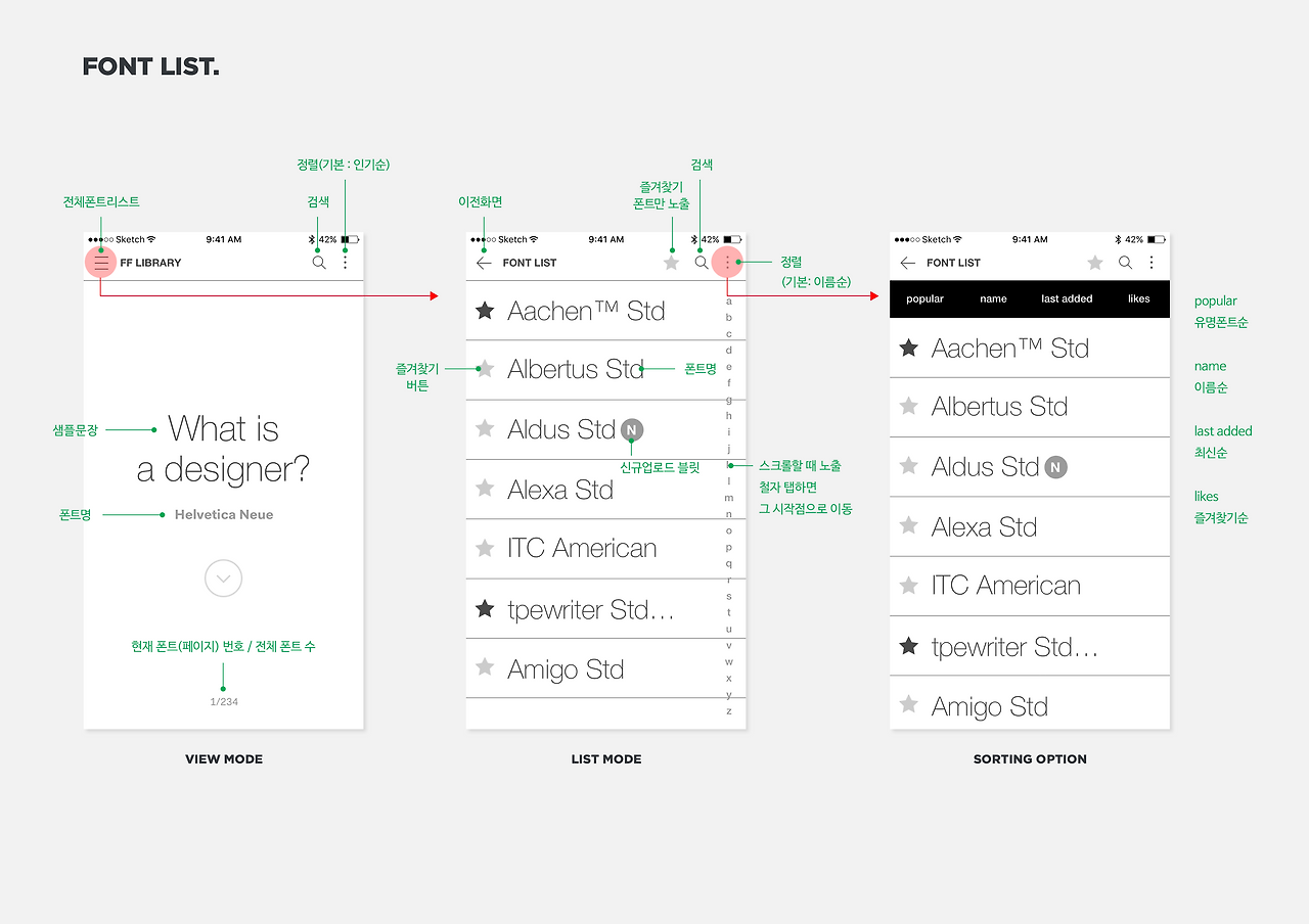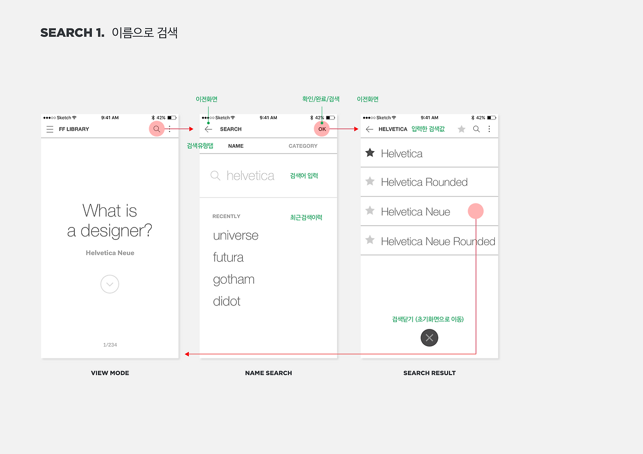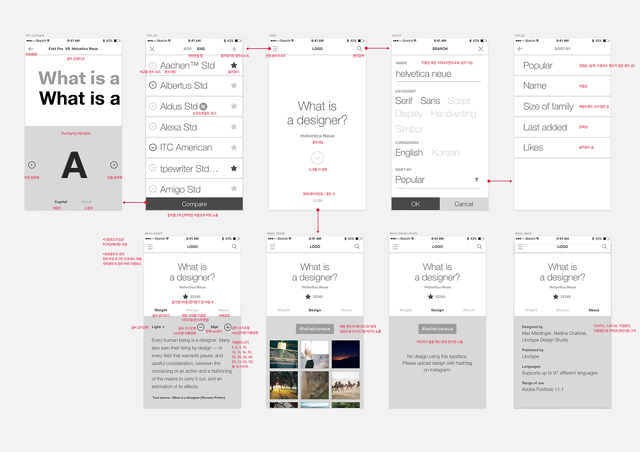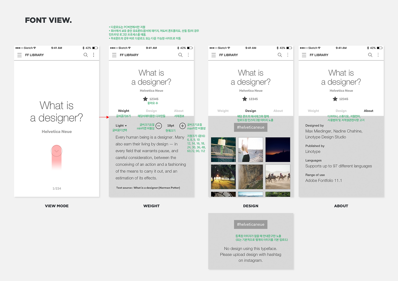 곧바로 모바일은 협업에 있어서 커뮤니케이션에 도움을 주기 위한 용도로 보조적인 역할 정도 수행할 수 있게 하고 서체를 다운로드하는 등의 메인 기능은 PC가 되도록 계획을 수정했다. 하지만 PC용은 이것저것 고려사항−예를 들면 회사가 보유한 유료 서체를 다운로드하려면 인트라넷 로그인을 태운다던지−이 많았기 때문에 프로토타입은 상대적으로 PC에 비해 기능이 축소된 모바일을 먼저 진행하기로 했다.