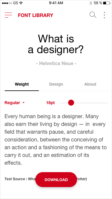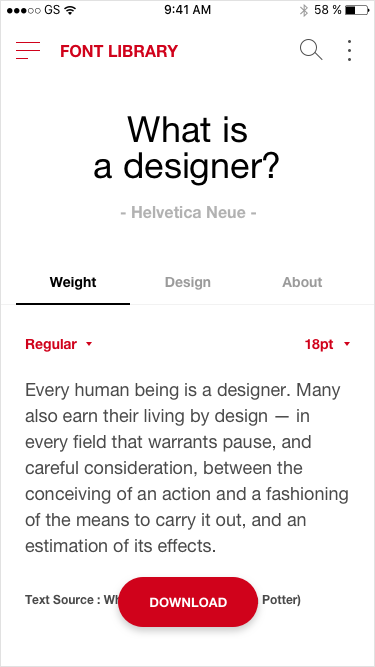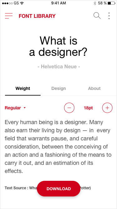 디자인은 초기 버전의 톤 앤 매너를 중심으로 디벨롭하는 방향으로 진행했다. 초기 버전은 폰트의 이미지를 컬러로 녹이려는 의도가 있었지만 이 사이트에 들어올 디자이너들의 목적인 '내 디자인에 어울리는 서체'를 찾는 것을 생각했을 때 컬러로 인한 선입견이 생기지 않도록 black & white가 기본이 되도록 했고 회사의 아이덴티티를 조금 가미할 수 있게 red를 포인트 컬러로 사용했다.
