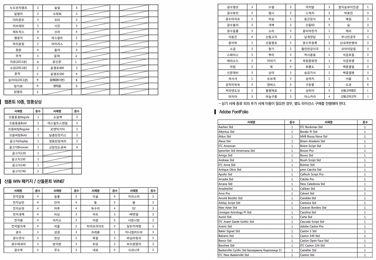 이 리스트만으로는 생김새나 최소한의 서체 정보를 알 길이 없어 실 작업에서는 아무 쓸모가 없다. 또 이 문서는 사내 디지털 라이브러리의 이북 형태로 제공되는데 유감스럽게도 검색 기능이 제공되지 않아 라이선스의 유무에 대한 검색조차도 불가능하다. 결국 '구글링 또는 사내 서버에서 서체 검색→형태 확인→설치 및 적용'의 과정을 반복하게 된다. 이 모든 것이 에이전시의 특성상 촉박한 일정에서 시간을 허비하는 것 같아 늘 불만이었다. 이렇다 보니 어떤 때는 급하니까 서체에 대한 고민 없이 쓰던 서체 또 쓰고 또 쓰고의 반복이 되기도 한다.