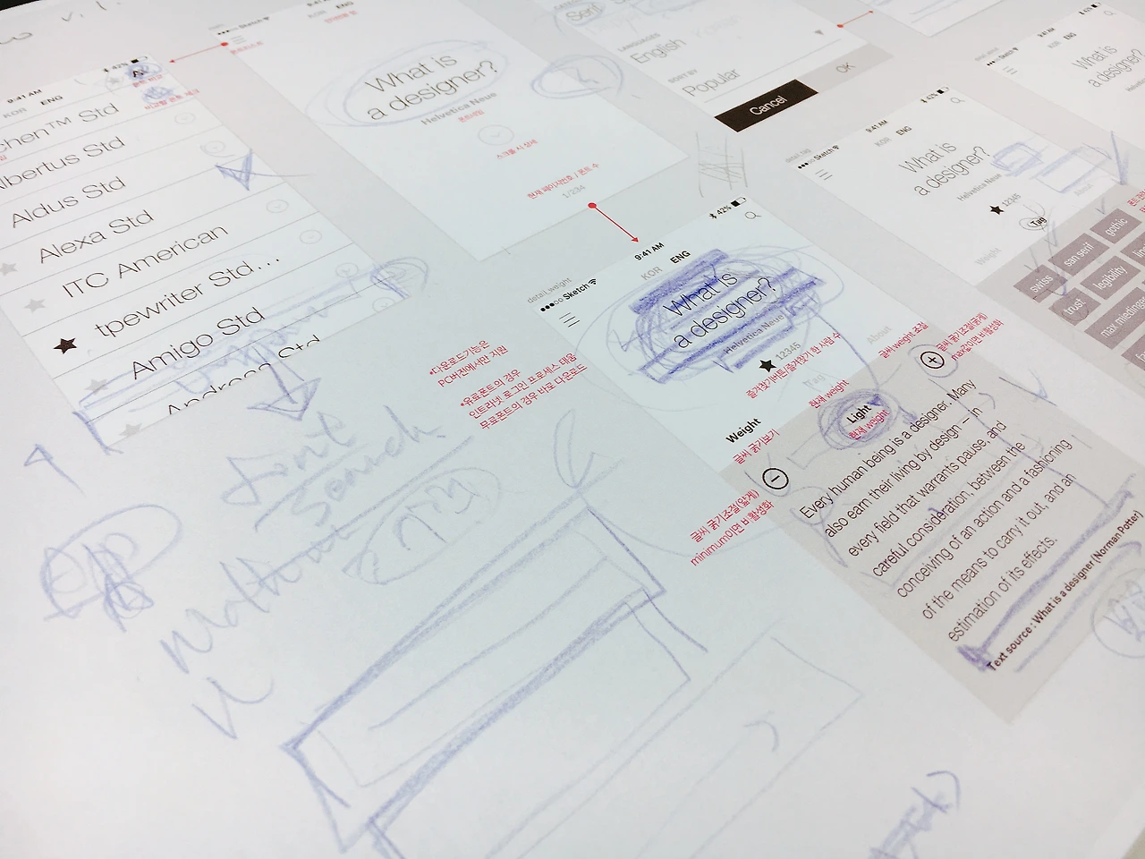 다른 것들은 초기 버전에서 크게 달라지지 않았지만 기능이 집중된 서체 상세보기에서의 UI는 많은 고민을 거듭했다. 특히 모바일 버전은 작은 화면에서 서체 크기 조정하는 부분이 정교하면서도 편하게 변경 가능한 UI가 어떤 게 있을까에 대해 오래 고민했었다.