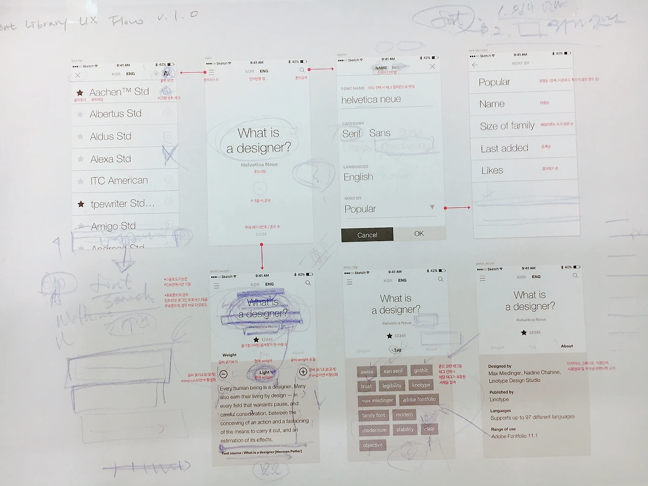 정의된 기능을 중심으로 UX플로우를 작업하기 시작했다. 기능을 중심으로 작업된 플로우 설계는 CD님과 커뮤니케이션하면서 수정과 발전을 거듭했다. 이 과정에서 상당히 많은 기능들이 삭제되고 콤팩트 하게 변경되었는데 이유는 이 기능들로 인해 점점 서체에 대한 집중도가 떨어지는 것 같았고 기준으로 잡았던 일정 내에 이 기능들을 구현하는 건 욕심이겠다는 생각이 들었다. 그래서 플로우를 작업하면서 서체에 집중할 수 있도록 불필요하다고 판단되는 기능은 삭제, 필요하지만 급하지 않은 것들은 후에 디벨롭할 때 구현하도록 따로 분류했고 결과는 아주 콤팩트 해졌다.