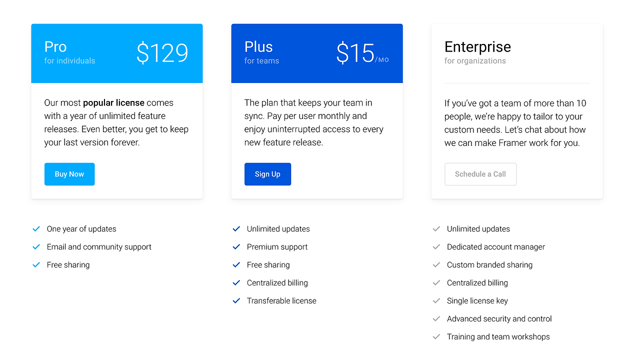 라이선스와 플랜에 관련하여 더 궁금한 사항은 https://framerjs.com/pricing/ 여기를 참조.