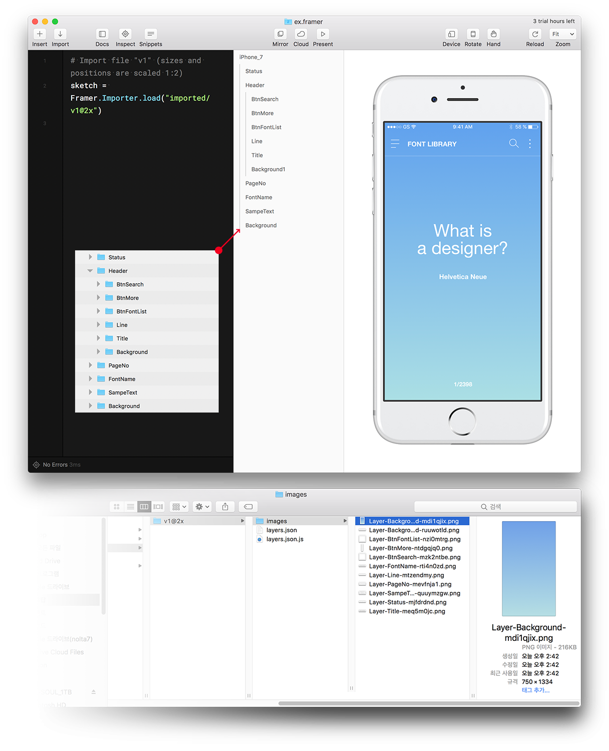 예시는 지금 내가 개인 프로젝트로 진행 중인 파일의 초안을 불러와봤다. 스케치 레이어 화면을 보면 HEADER라는 그룹 안에 BtnMore와 BtnFontList만 그룹으로 지정하고 나머지는 그룹화하지 않았다. 이 파일을 framer로 import 하면 레이어가 보이는 공간에 그룹으로 그룹화하지 않은 요소들은 보이지 않는 것을 알 수 있다. 프로토타이프 파일의 폴더에서 import 된 소스를 찾아보면 그룹화하지 않은 요소들이 하나의 이미지로 통합된 것을 볼 수 있다.