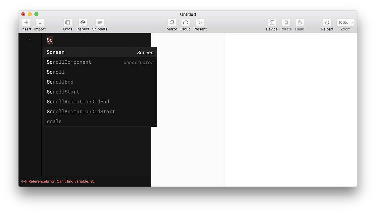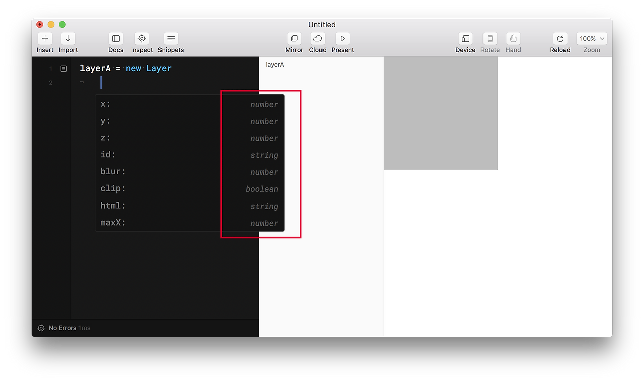 height는 layerA의 높이를 말한다. 단일 단어이므로 모두 소문자로 사용되었다. backgroundColor의 경우를 보면 background와 color, 2개의 단어가 결합된 문자다. 그래서 뒷 단어인 color의 첫머리 c가 소문자가 아닌 대문자로 쓰였다. 붙여쓰는 것 뿐만 아니라 띄어쓰기를 하더라도 뒷 단어의 시작은 대문자를 사용한다. 이런 대소문자 구분을 잘못해서 오류나는 경우가 생각보다 굉장히 많다. 하지만 걱정마시라. framer는 친절해서 자동완성 기능을 제공하기 때문에 모두 타이핑할 필요가 거의 없다.