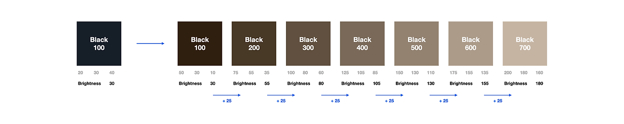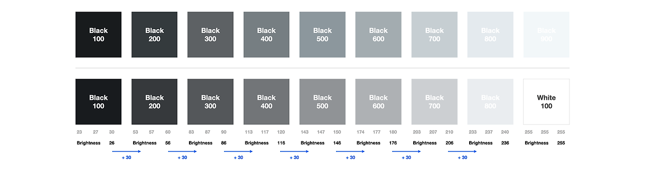 컬러 스펙트럼 간 간격 수치를 맞추기 위해 첫번째는 기존 black 100을 기준으로 일정한 명도 간격을 가진 스펙트럼을 위해 (계산이 쉽도록) R, G, B 값에 각 30씩 더해보기로 했다.