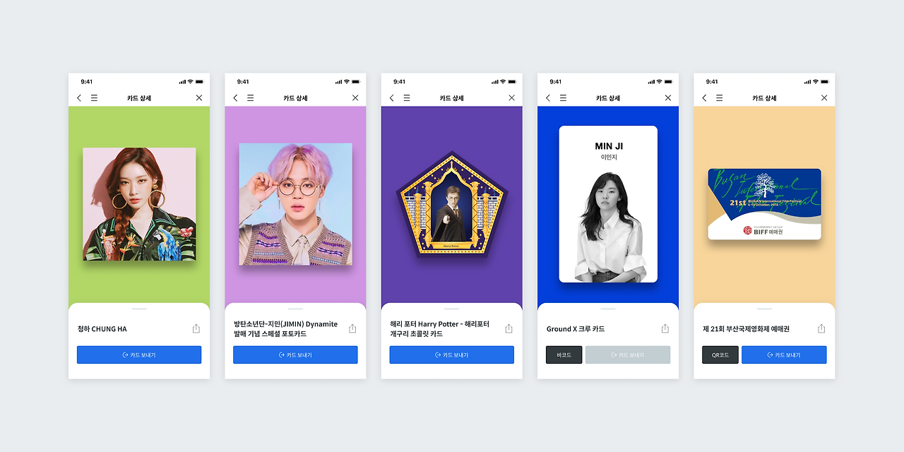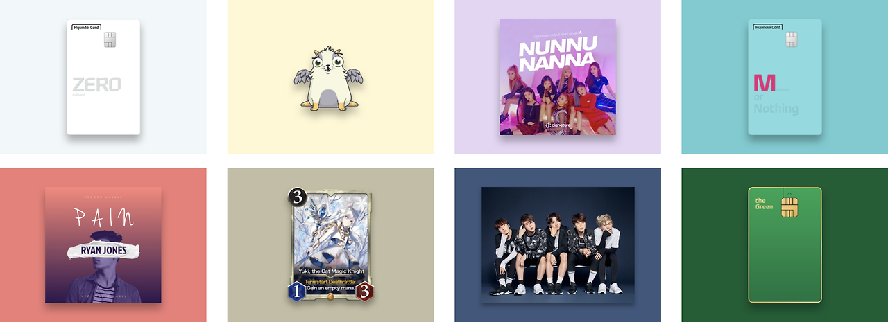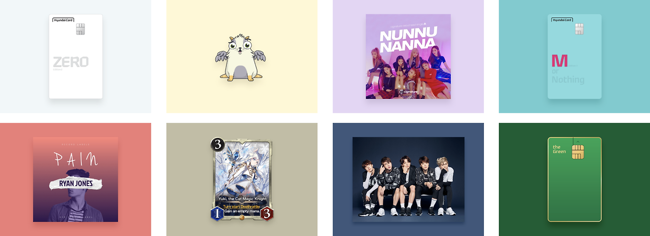 당시 내부에서는 디지털 자산 중 하나인 카드*가 자산처럼 느껴질 수 있도록 화면에서 조금 더 '카드스러웠으면(?) 좋겠다'는 니즈가 있었고 '어떻게 하면 무형의 자산을 실존하는 것으로 느끼게 할 수 있을까' 고민이 많았다. (*여기서 '카드'란 블록체인의 NFT를 의미한다.)