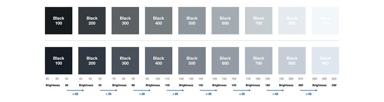 막상 명도를 조정해서 스펙트럼을 만들어보니 기존의 스펙트럼에 비하면 웜톤의 스펙트럼처럼 느껴졌고 간격 폭이 넓었던 탓인지 스펙트럼이 짧아졌다. 포인트컬러가 블루인만큼 black과 grey 스펙트럼에서도 쿨톤이 더 확실하면서 9개의 색상이 나오길 바랐다. 이미 9개의 색상이 다양한 화면에서 사용되고 있기 때문에 그 색상들을 대체할 색상의 수도 동일해야 했기 때문이다. 그래서 두번째는, 기준이 되었던 black 100의 수치를 조정해서 R과 B의 간격을 차이 나게 조정한 다음, 이 컬러를 기준으로 명도 계산식을 이용해 스펙트럼을 만들어보기로 했다.