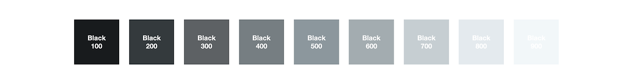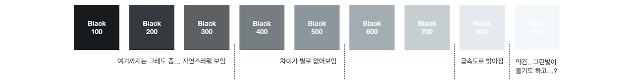 black 100을 기준으로 조금씩 밝아지도록 스펙트럼을 만들었는데, 자연스러워보이는 것 같은 느.낌.에 기.대.어 피커로 찍어 만든 스펙트럼이었다. 하지만 가이드를 정리하려고 다시보니 뭔가 어색했다. black100부터 300까지는 그나마 좀 자연스러웠는데 400과 500은 그 앞의 단계보다 차이가 크지 않게 느껴졌고, 800에서 급속도로 밝아져서 900에서는 그린빛이 도는 것 같은 느낌이었다. (물론 모니터에 따라 다르게 보일 수 있다.)