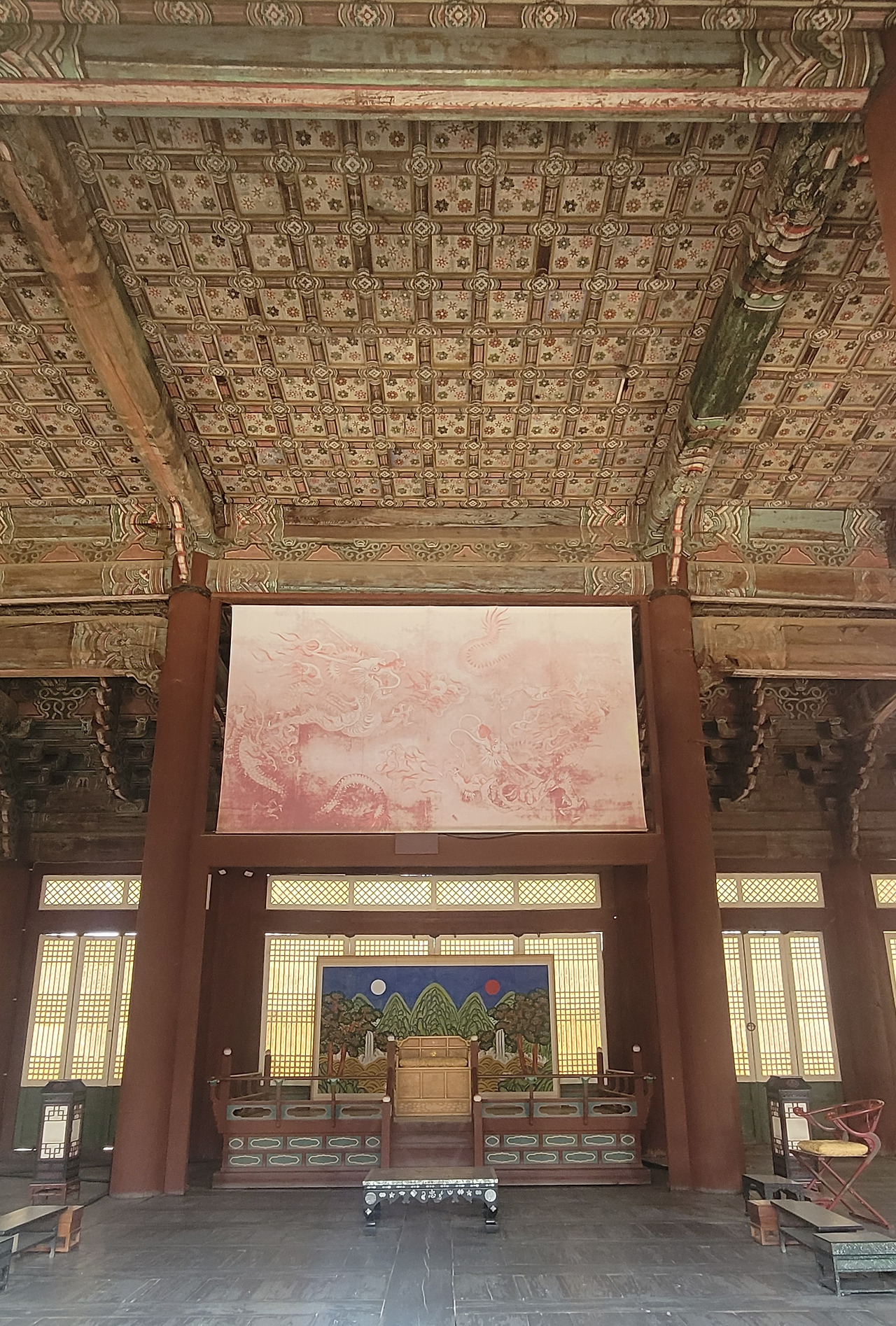 근정전에 있는 일월오봉도는 왕의 상징물로 왕이 가는 곳 어디나 가지고 다녔다고 하며 중국과 일본에는 없는 우리나라에만 있는 유일한 장식이라고 한다. 무조건 중국 예법에 따른 것으로 알고 있었는데 그나마 주체적인 것이 있다고 해서 다행이라는 생각이 들었다. 만 원짜리 지폐에 일월오봉도가 담겨 있다는 사실도 새롭게 알게 된 것이다.