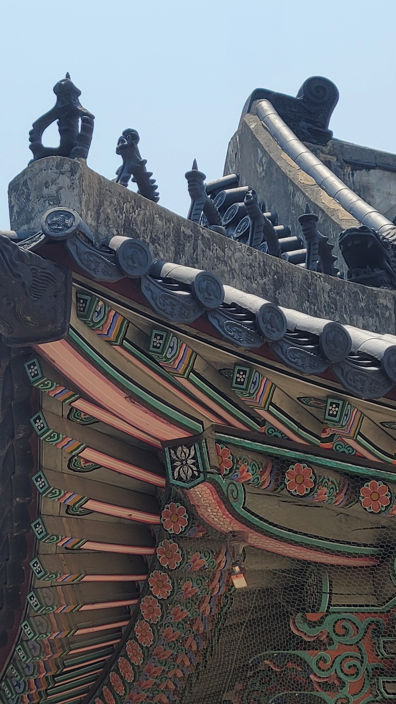 전각의 처마 밑에는 부시라는 그물이 처져있는 데 새들이 깃들이지 못하도록 예방하는 조치다. 새들이 살면 뱀이 들어올 수 있고 쉽게 오염되는 것을 예방하기 위한 대책이었다. 그래서 '망쳤다'라는 말이 생겼다는데 이것은 믿거나 말거나 같다.