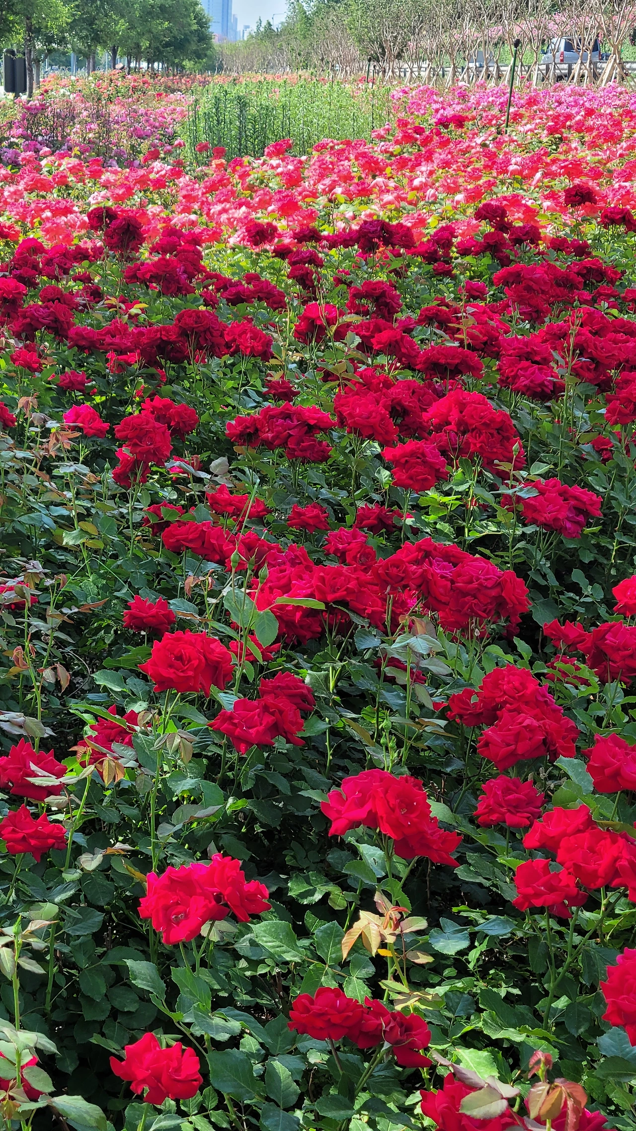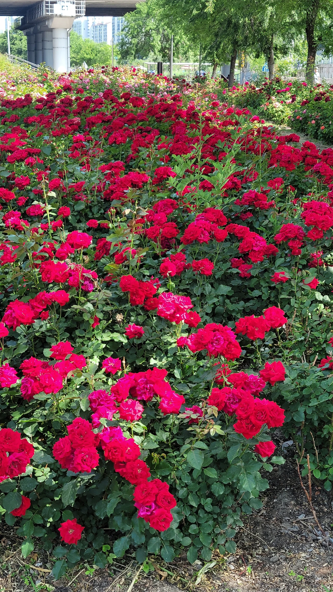 오월을 빛내는 꽃은 단연 장미를 꼽을 수 있다. 동부간선 도로변에는 덩굴장미가 띠를 두르듯 길게 늘어져 꽃이 만발하여 고급스럽다. 자전거 도로 길 옆에도 셀 수 없는 장미꽃이 피어 꽃밭이 장관을 이루고 있다. 형형색색의 장미가 저마다 미모를 자랑하며 길가를 수놓고 있는 길이 햇살아래 눈부시다. 다양한 컬러와 여러 가지 모양의 장미가 군락을 이루며 피었는데 압권은 역시 붉은 장미가 아닐 수 없다. 진녹색의 잎들에 둘러싸여 핏빛 같은 붉은빛을 뿜어내는 장미가 선명한 보색으로 빼어난 정경을 선보인다. 붉은 장미가 정열적인 사랑의 기운을 매혹이라는 단어로 마음에 아로새긴다. 거기에 더하여 강렬하게 마음을 흔드는 고혹적인 향기가 코를 매료시킨다. 좋은 냄새도 많지만 장미 향기처럼 우아하면서 자극적인 향기도 없는 것 같다. 붉은 장미와 정열적인 사랑은 태생부터 하나인 것처럼 느껴진다.