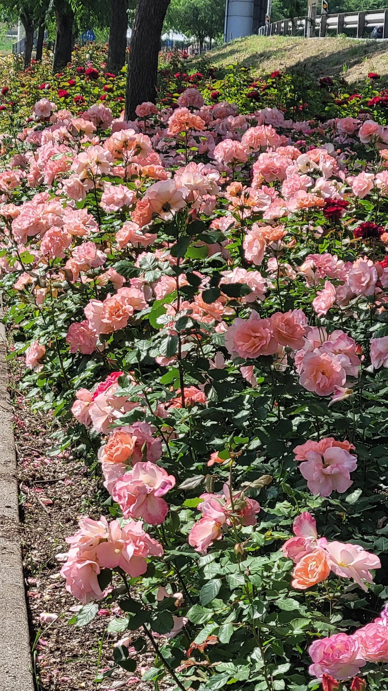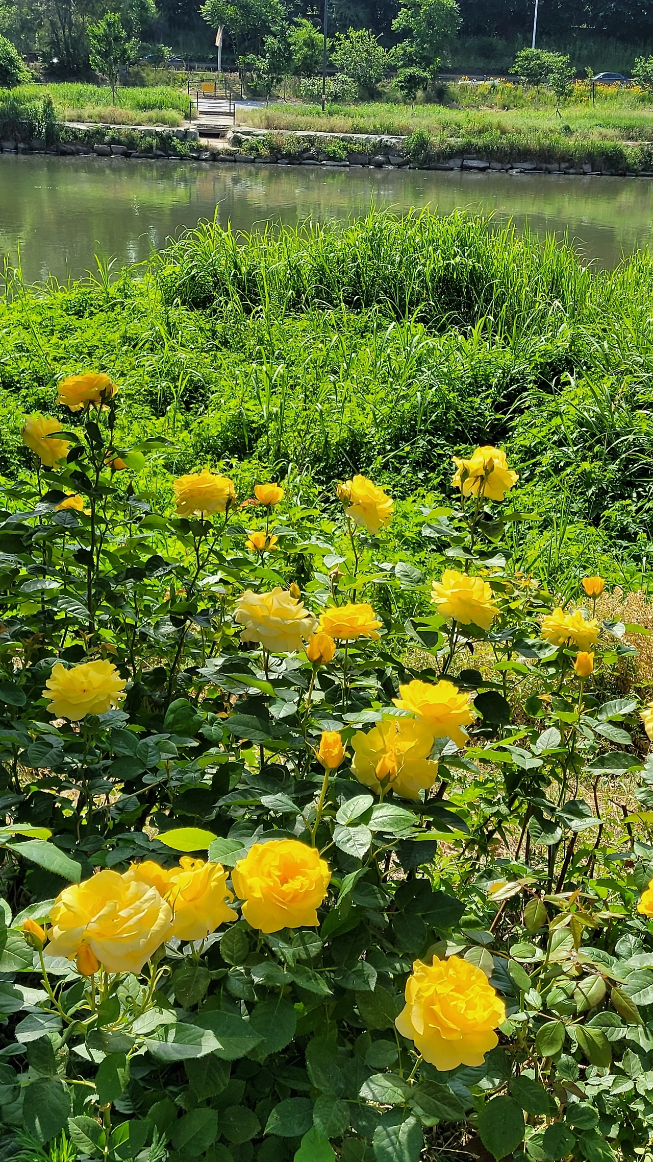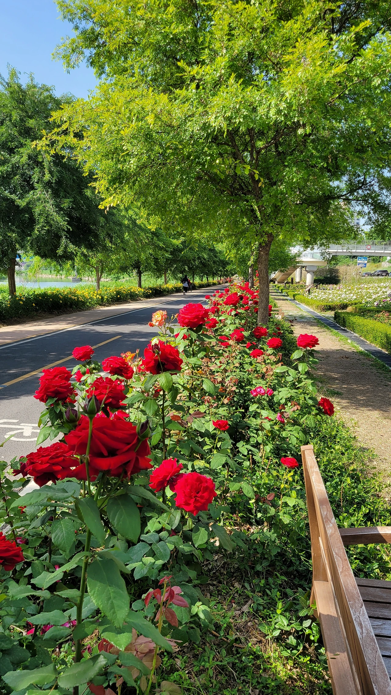 꽃밭에서 시간 가는 줄을 모르고 넋을 놓고 있다가 퍼뜩 정신을 차린다. 세이렌의 노랫소리에 마음을 뺏긴 뱃사람들의 심정이다. 여유를 가지고 출발했지만 꽃놀이에 시간을 너무 많이 허비했다. 페달을 밟는 발이 아주 바빠진다. 빠르게 달리는 길가에 장미가 여전히 고운 미소를 건넨다. 오월이 저물어 가는 때 아침에 만난 장미로 큰 기쁨을 선사받았다. 행복한 오월이 아닐 수 없다.