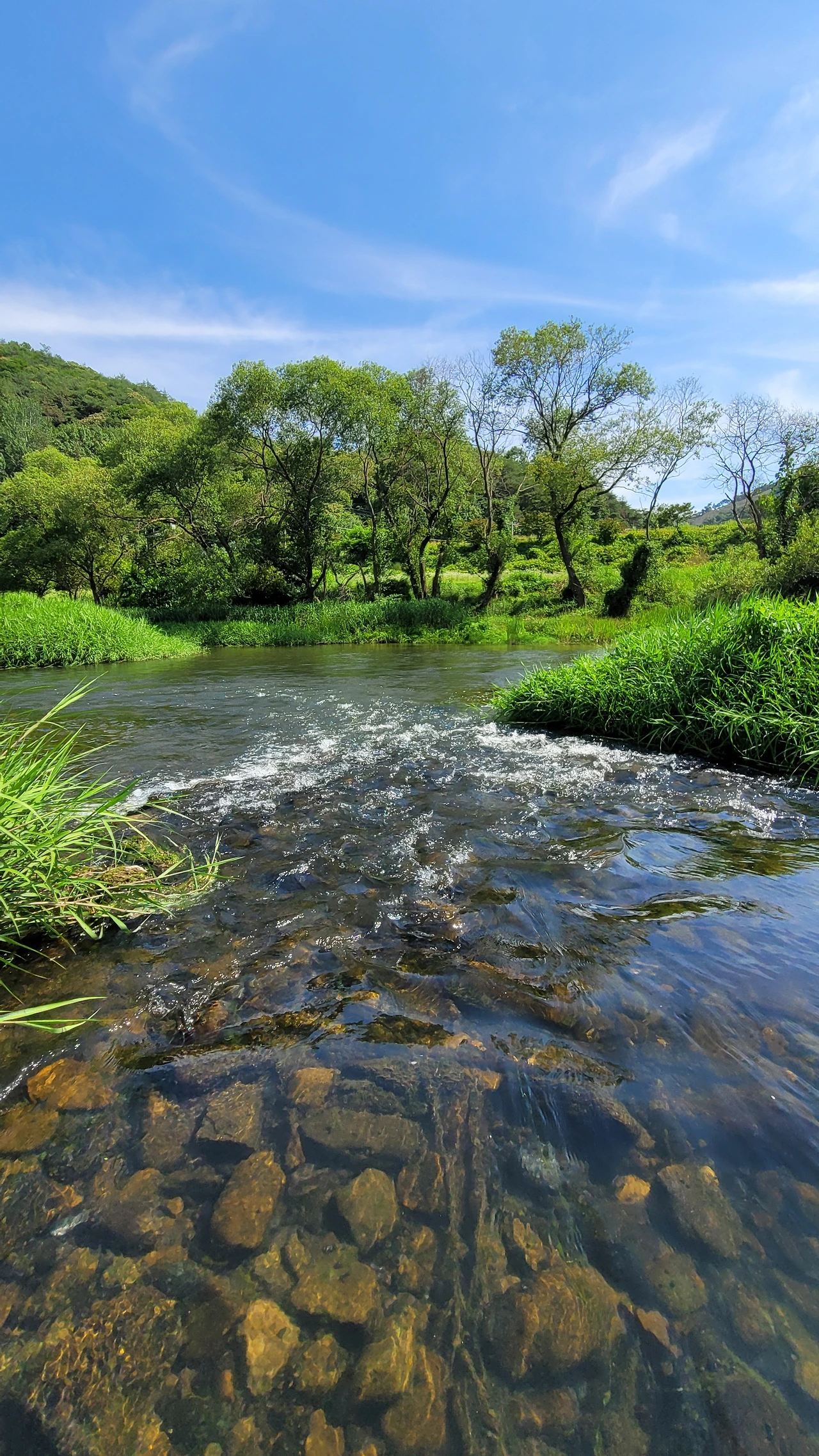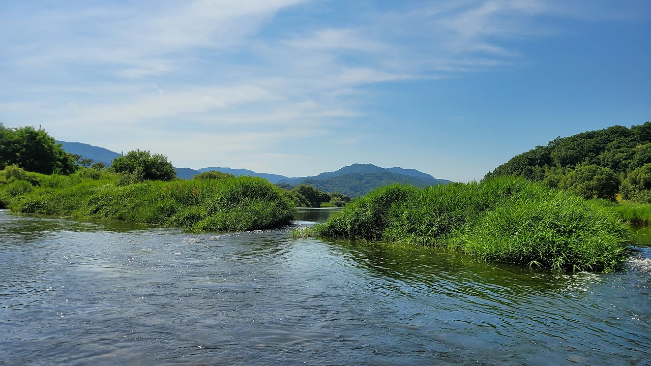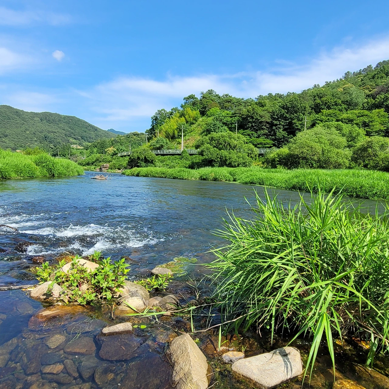 수풀이 우거진 강물은 작열하는 태양 아래 윤슬이 번뜩이며 힘차게 흐른다.