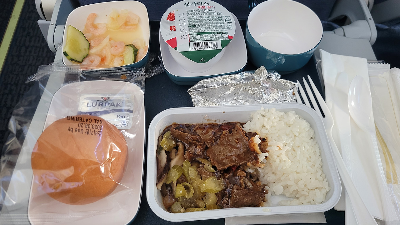 베이징 경유라 비행시간이 짧아 기내식을 기대하지 않았다. 소불고기 조림과 여주와 표고버섯볶음에 밥이 나왔고 빵과 버터에 딸기 요구르트로 기대 이상이었다. 배가 고프지 않았지만 기내식은 해외여행의 즐거움 중 하나라 남기지 않고 싹싹 비웠다.