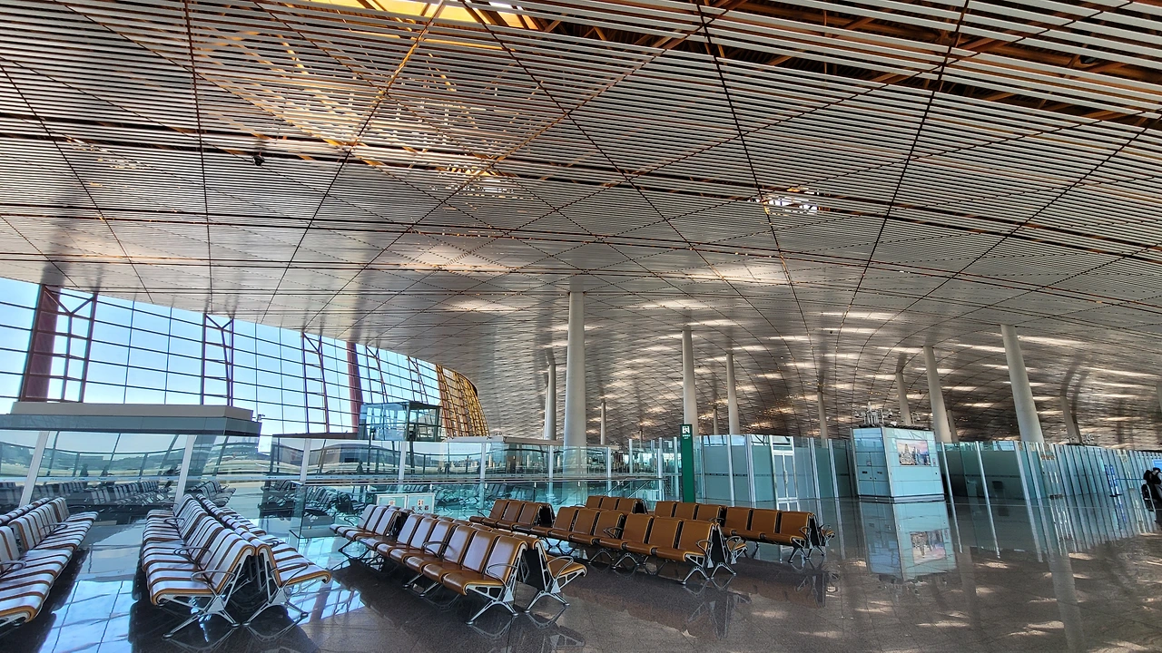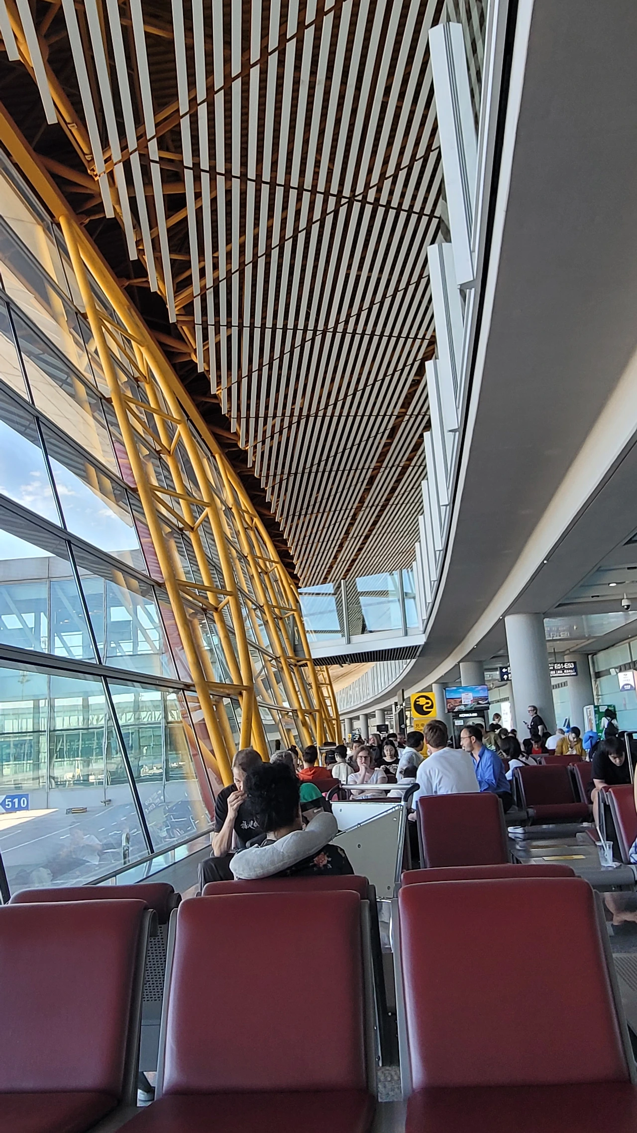 공항 라운지에 들어서서 공항의 외양을 보았다. 멀리 보이는 거대한 돔을 이루는 기둥들이 위압감을 준다. 공항의 구조가 우리나라와 비슷하지만 눈에 띄는 차이는 붉은색이다. 중국인들이 선호하는 붉은빛의 기둥이 선명하다.