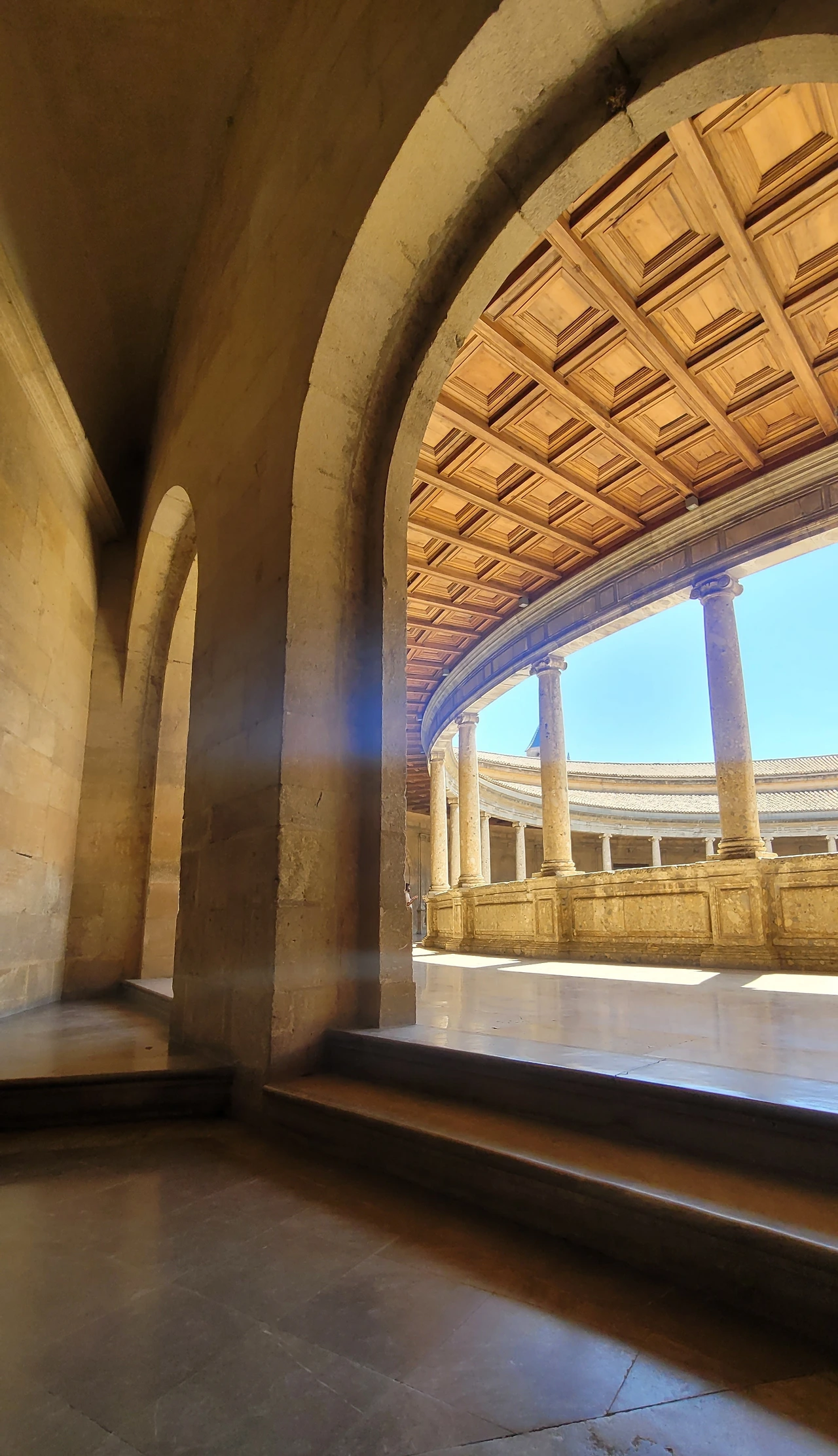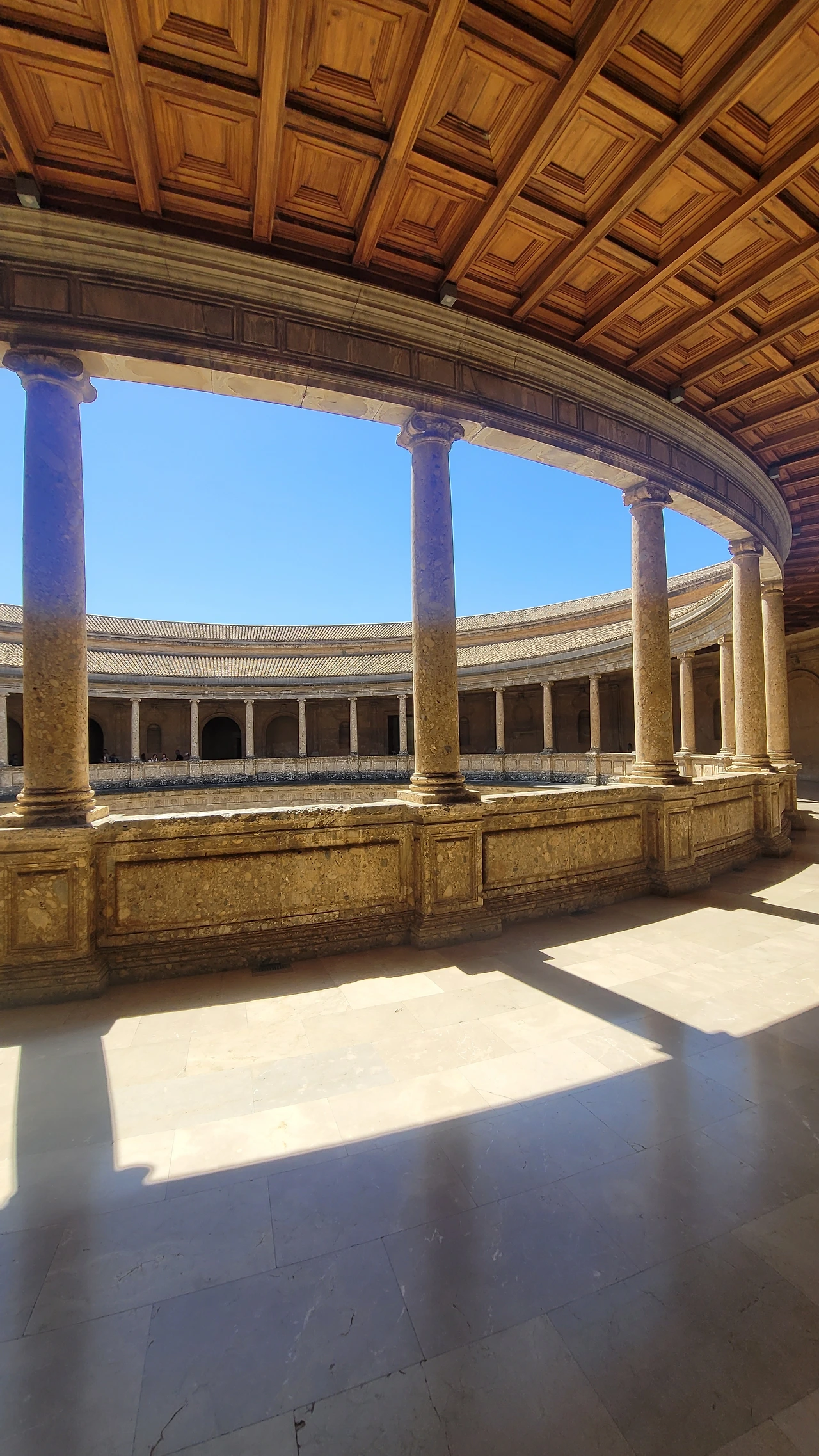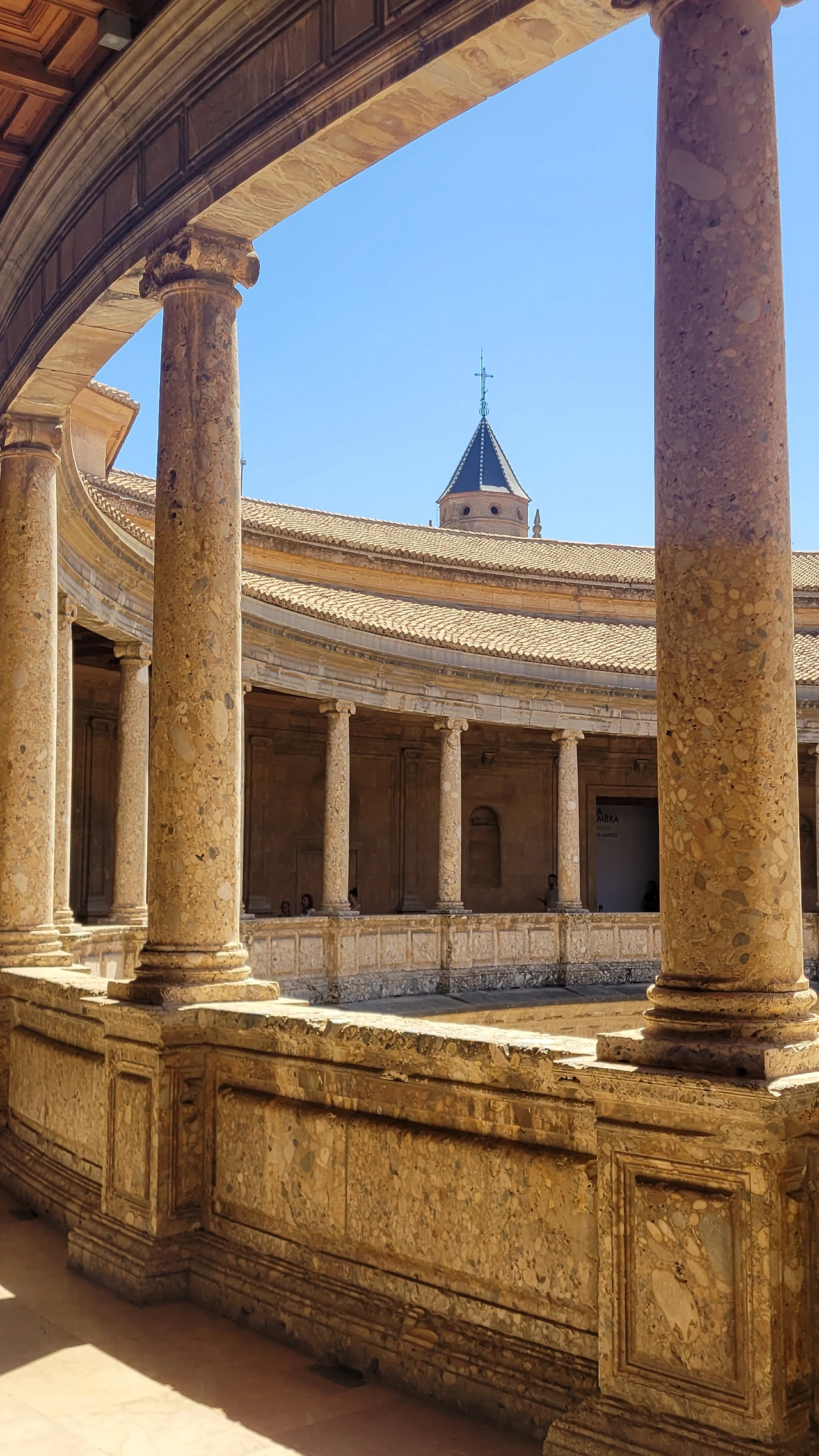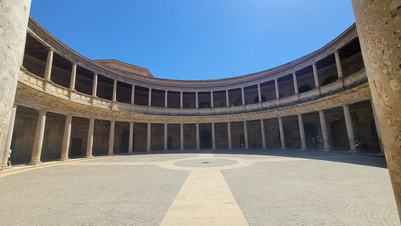 첫 관람 장소는 카를로스 5세 궁이었는데 다소 투박하고 육중한 외관을 지녔다. 네모인 궁에 입장해 보니 천장은 개방이고 안 쪽은 원형 경기장처럼 원형 광장이 있다. 투우를 이곳에서 했다고 전해진다. 이층으로 되어있는 둘레에는 방들이 배치되어 있는 독특한 구조의 건물이다.