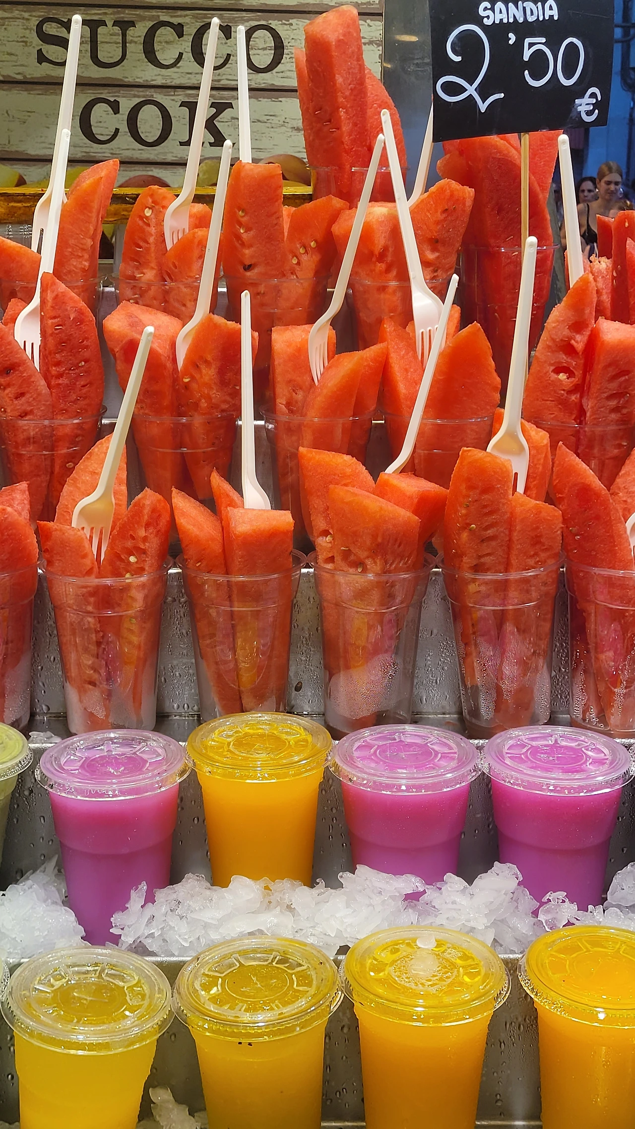 첫날은 여유롭게 시내를 둘러보며 보케리아시장을 가는 것으로 일정을 잡았다. 먹음직스러운 과일들이 많았고 해산물과 하몽도 주요한 메뉴였다. 관광객들이 몰려들어 북적였고 먹거리를 사들거나 구경하는 행렬이 줄을 이었다. 우리도 잘라 놓은 수박을 사서 맛보았고 토실하고 색감이 고운 복숭아를 구입했다. 하몽가게 사장님이 우리를 보고 한국어로 도토리 먹인 흑돼지라며 너스레를 떨며 맛을 보라고 했다. 얇게 베어준 하몽을 한 입 맛보았는데 기대 이상이었다. 엄지를 척 내보여주었다.