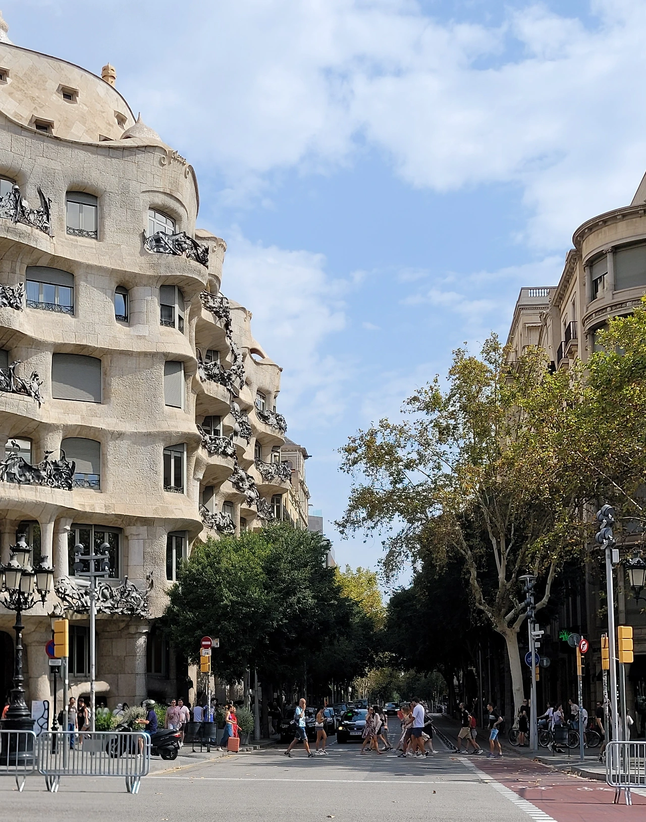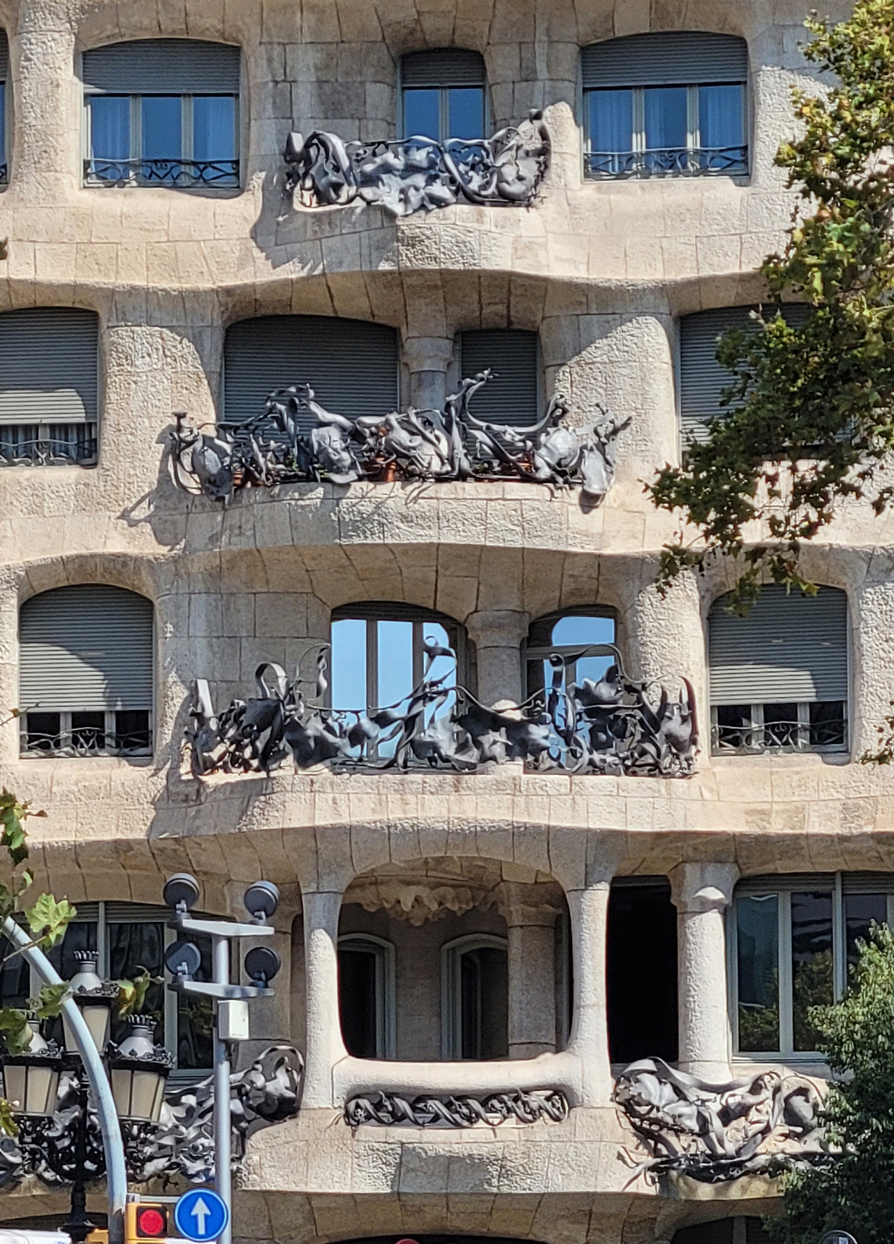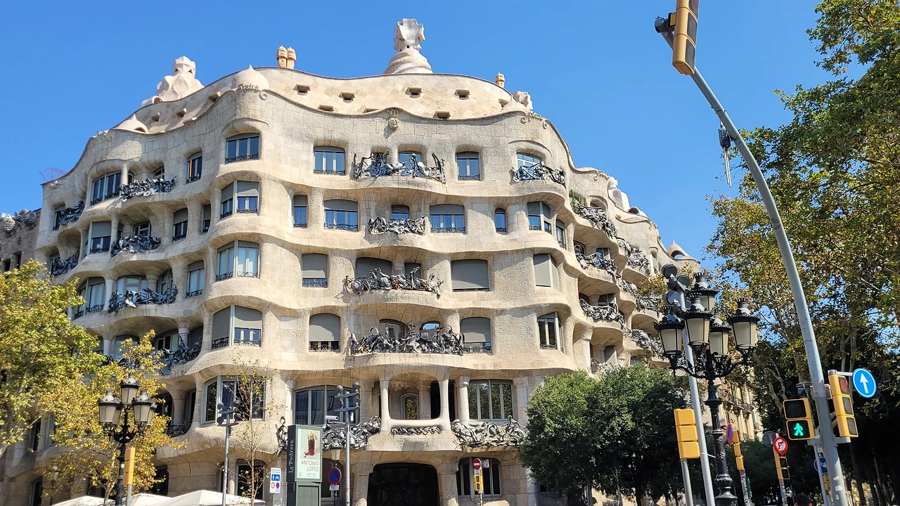 확실하게 까사 밀라는 밖에서 보기에 외관이 유려하다. 건물이 마치 물결치듯 둥근 테라스가 돌출되어 굽이치듯 이어지며 건물 전체를 감싼다. 건물 층이 위로 갈수록 조금씩 좁아지며 안정감을 준다. 테라스마다 각기 다른 32개의 해초 모양의 철제 장식물이 있어 바다의 분위기를 연출한다.