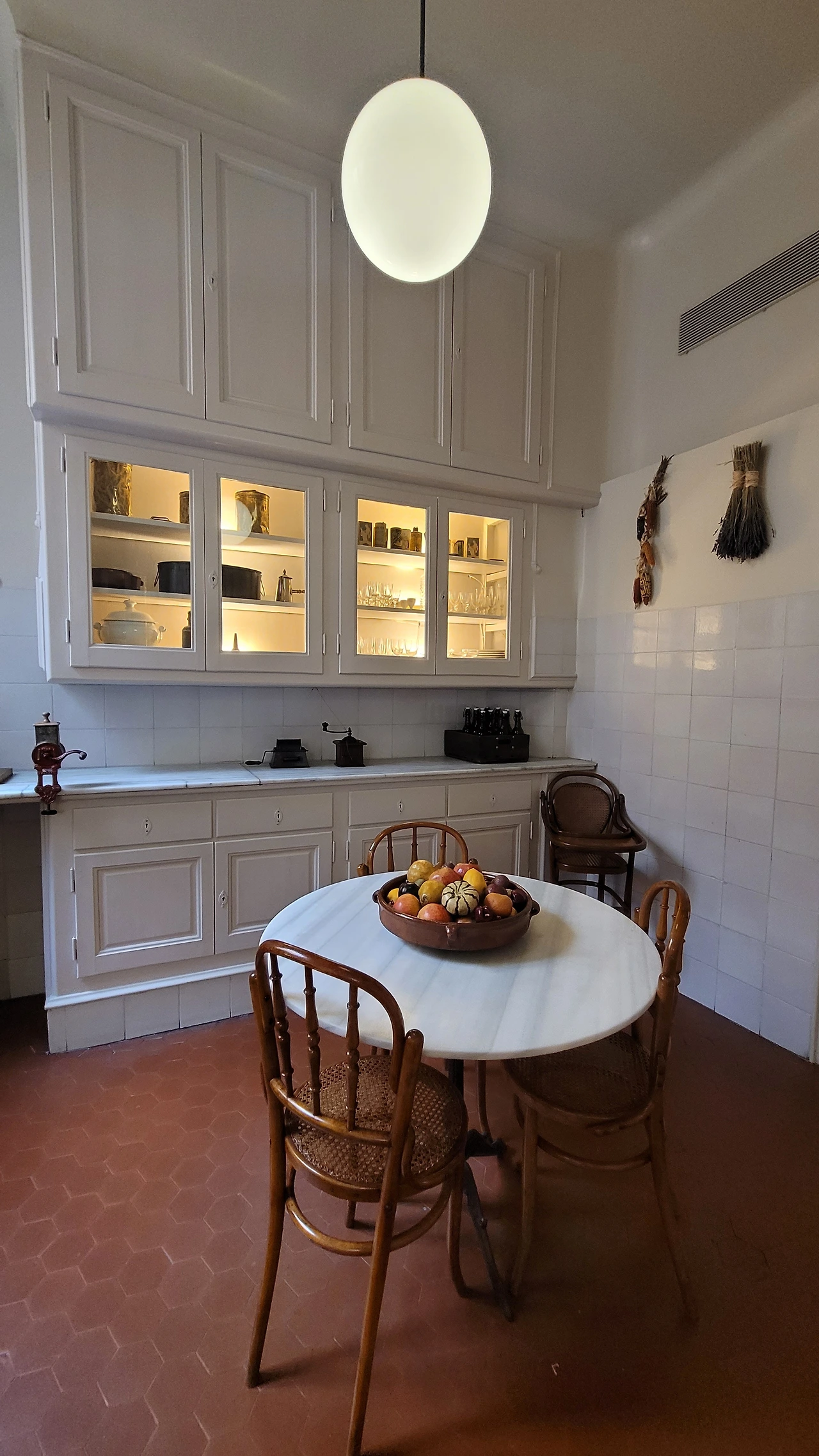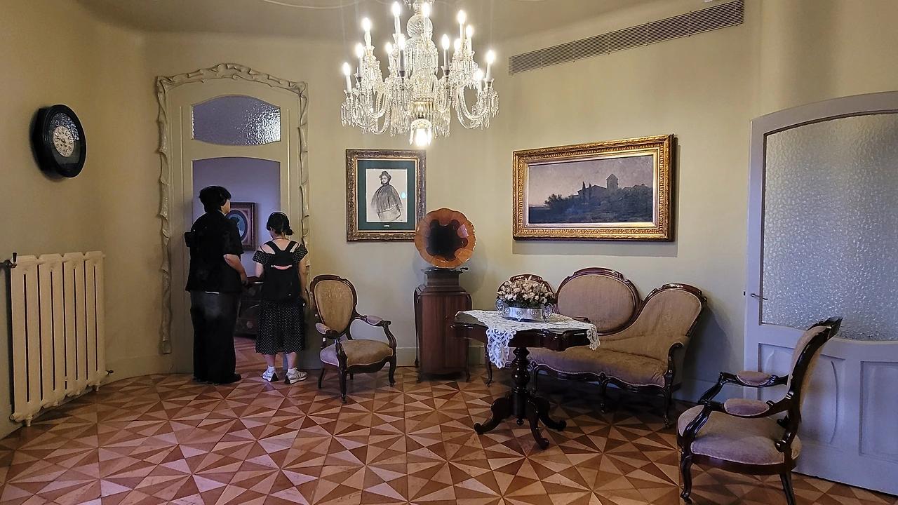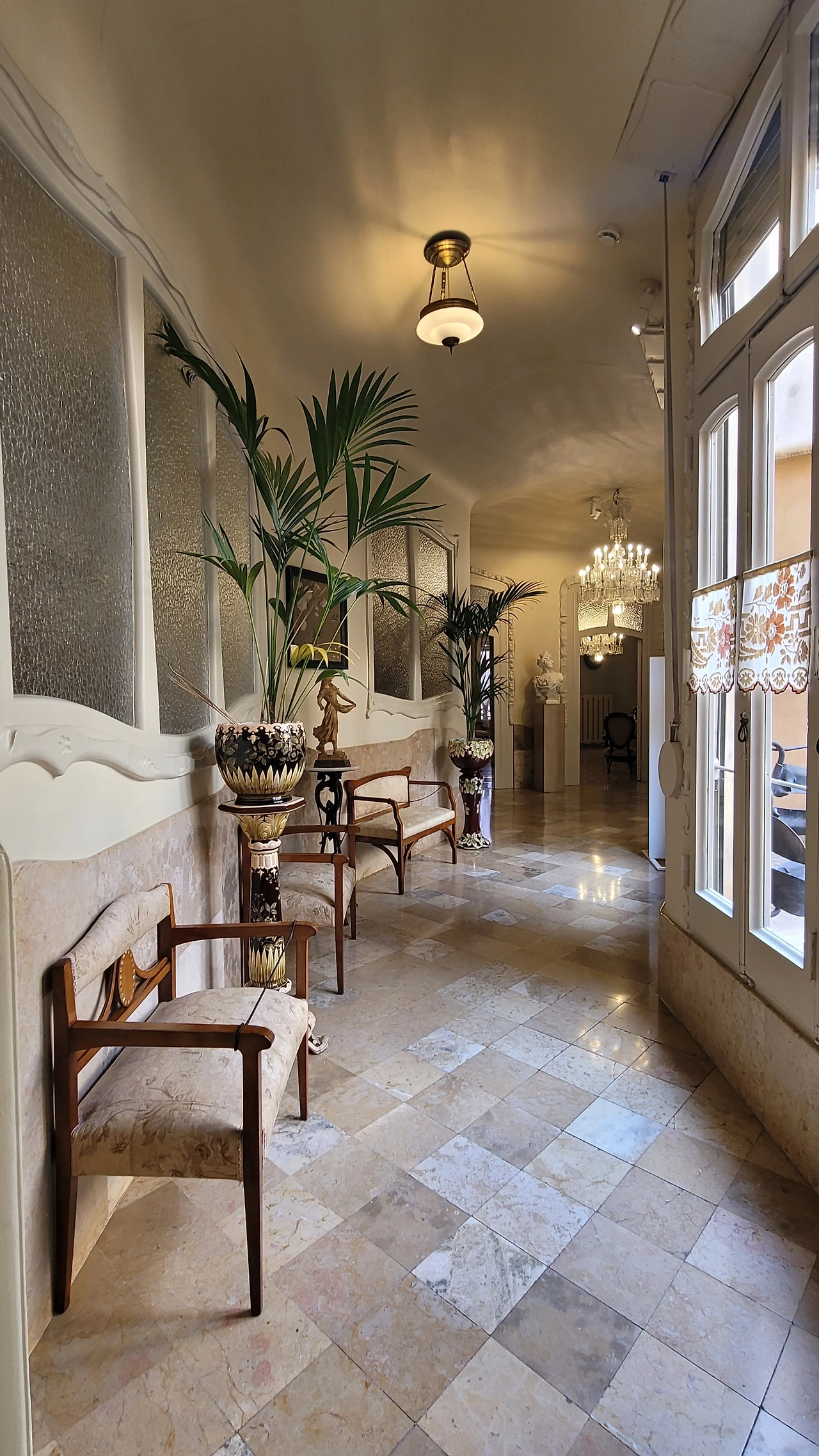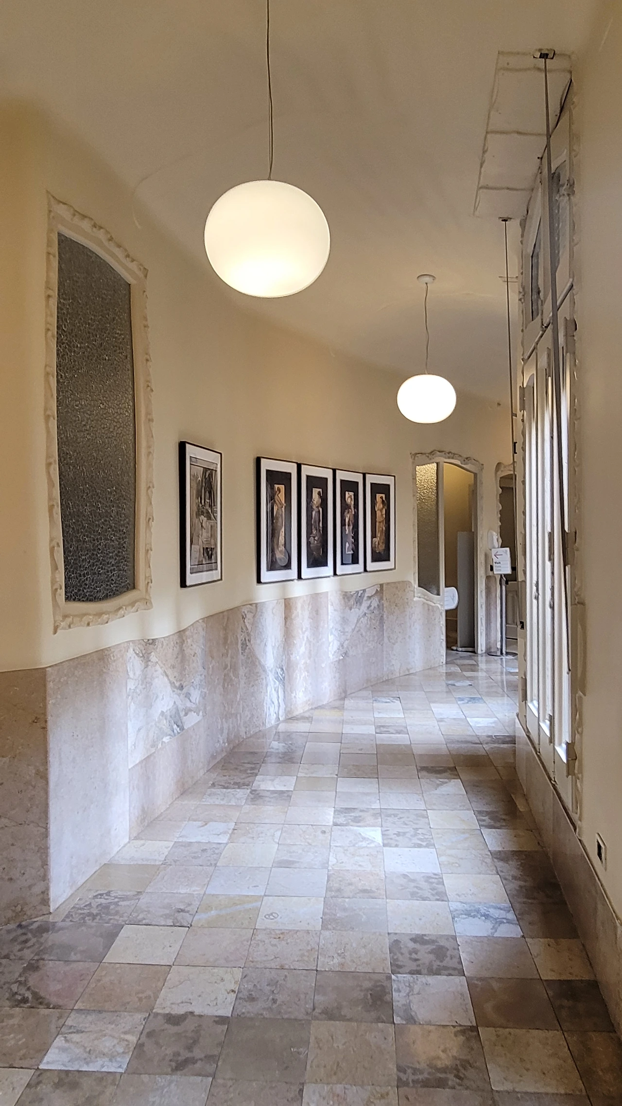 건물 내의 파티오(위 쪽이 트인 건물의 내부의 뜰)에서 위를 바라보니 확실하게 원형 건물이라는 것을 알 수 있다. 일직선으로 이어져 밖에서 보이는 건물의 높이보다 내부에서 바라본 층고가 훨씬 높아 보인다. 입구의 벽면도 보색을 칠하고 문양을 새겨 신비롭다. 막상 실내에 들어서니 밖에서 보는 외양이 파격적이고 독특함에 비해 건물 실내는 다소 평범하다는 생각이 들었다. 다만 가구나 널찍한 실내 공간이 여유로워 보였고 샹들리에를 비롯한 장식들이 고급스럽고 화려해서 최고급 주택의 풍모가 느껴졌다. 다만, 특이하게 빙 돌아가야 하는 원형의 복도가 신기했다.