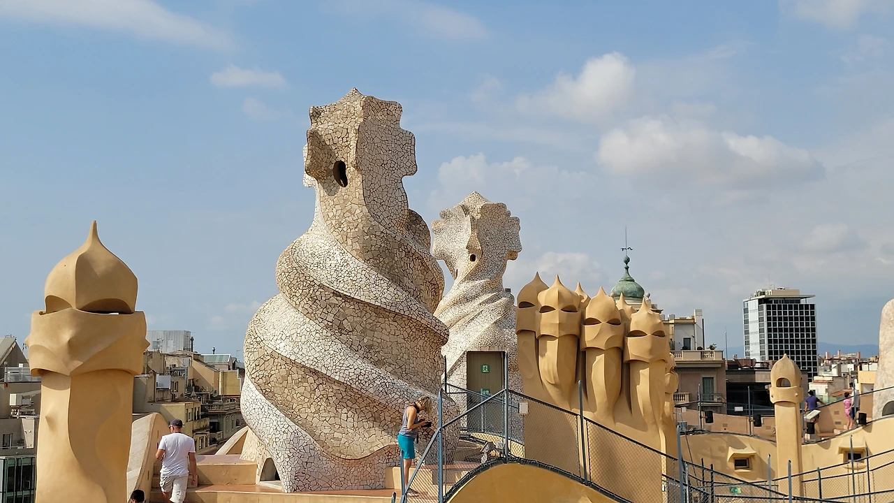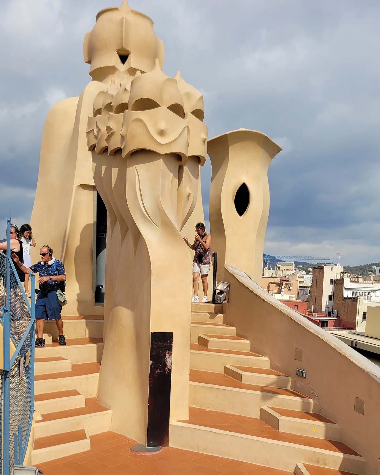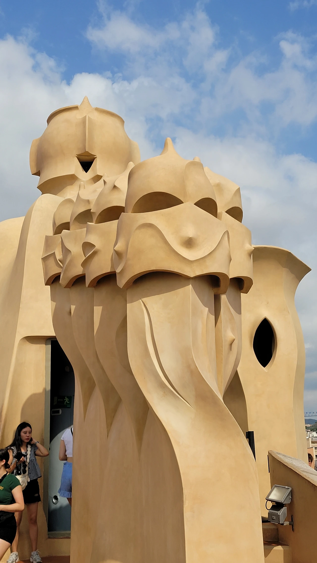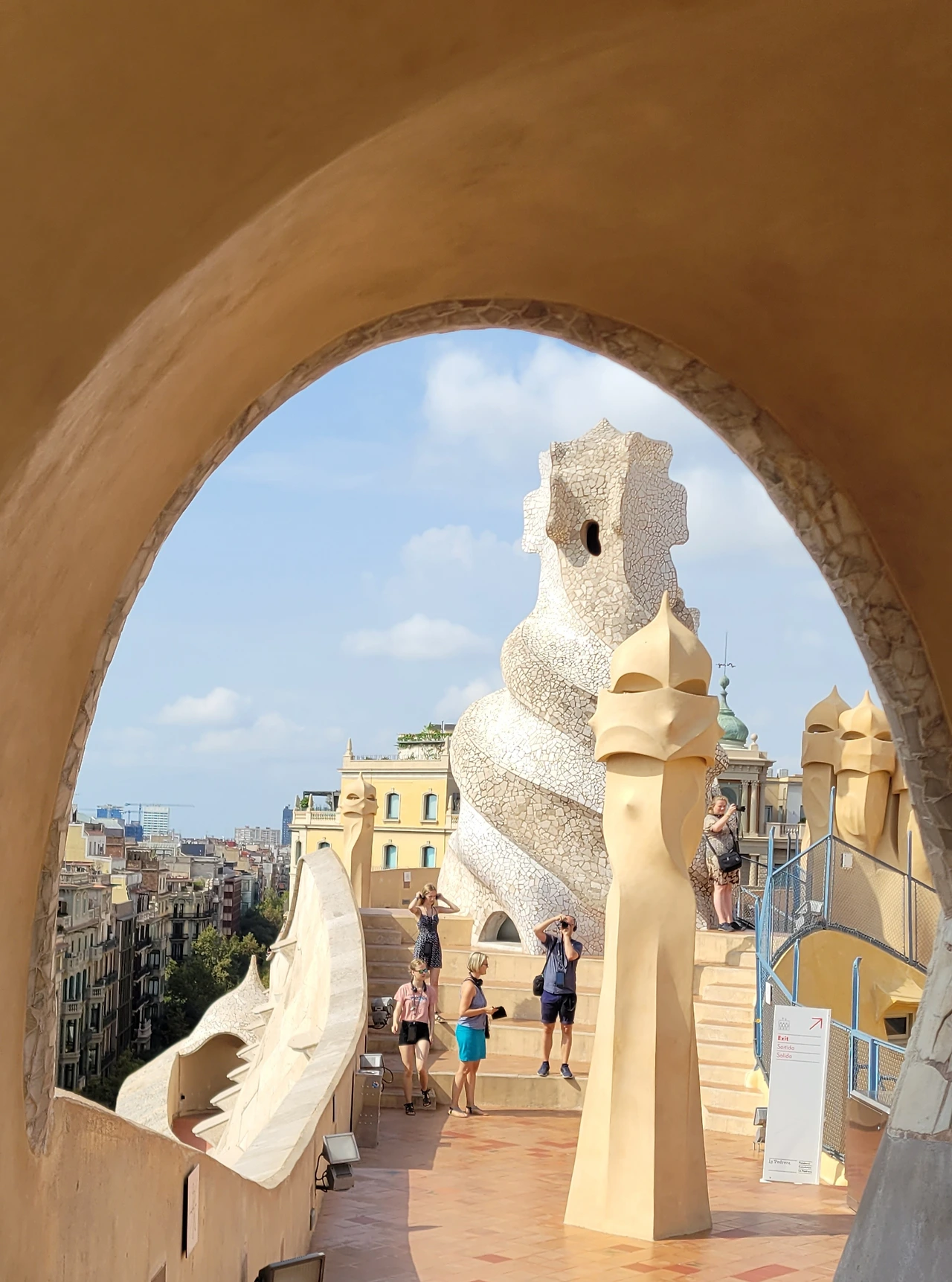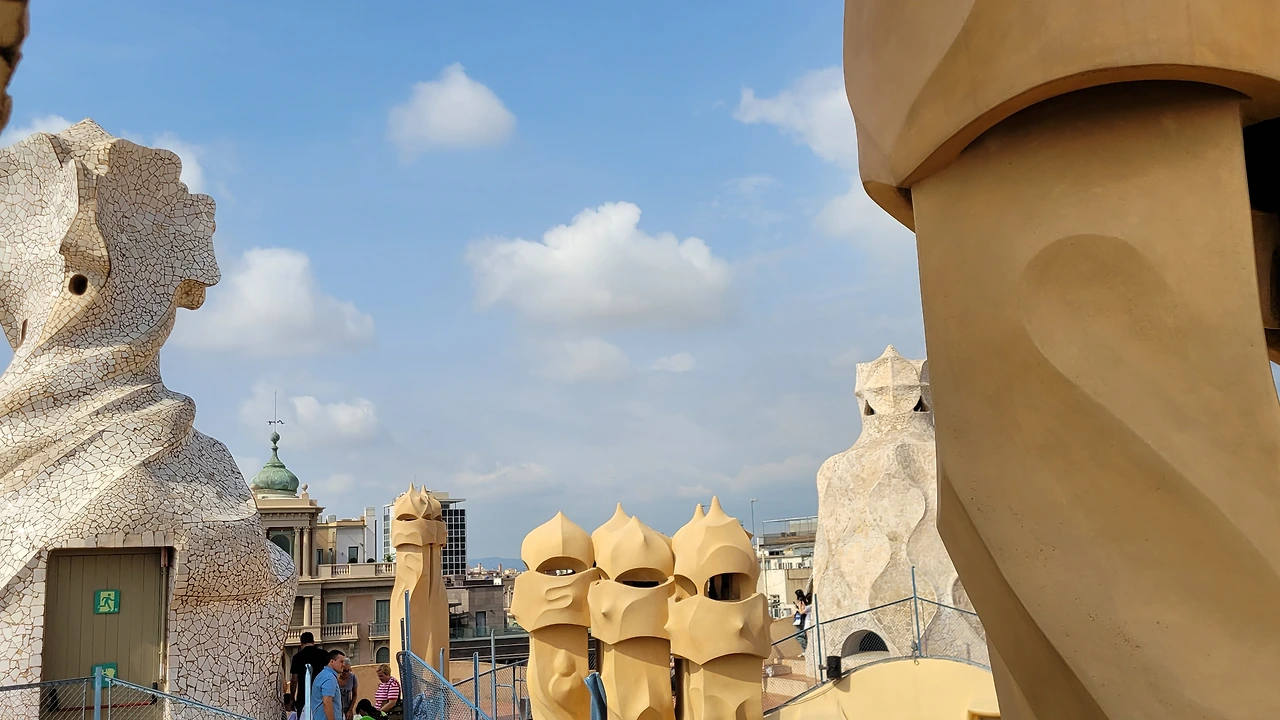 옥상에 들어서는 순간, 다양한 조형물들이 눈에 들어온다. 옥상도 다시 놀라운 세상이다. 가우디의 상상의 끝은 어디일까? 버섯 같기도 하고 거인처럼 보이기도 하고 철모를 쓴 로마 병사들도 보인다. 이 땅에 존재하지 않는 형상도 서있다. 모든 조각에도 곡선은 살아있다. 병사의 조각에는 투철하고 냉정한 전사의 굳은 기개도 느껴진다. 굴뚝을 이렇듯 기발하게 창조할 수 있다니 입이 다물어지지 않는다. 빙 돌아가며 둘러보는 데 볼 때마다 새로운 느낌이다. 굴뚝의 아치 사이로 보이는 풍경도 환상이다. 더구나 한쪽에서는 사그라다 파밀리아 성당도 보인다.