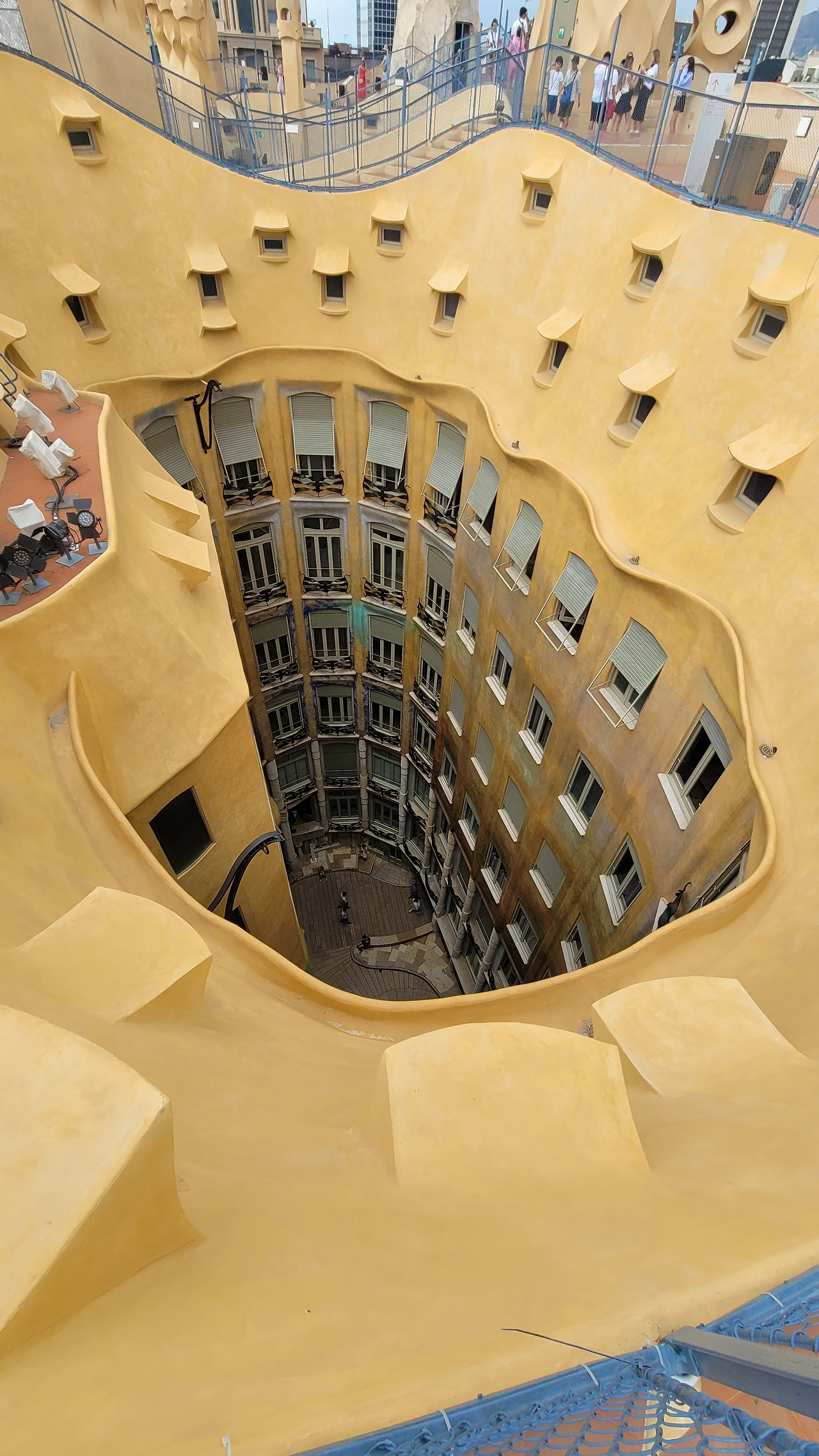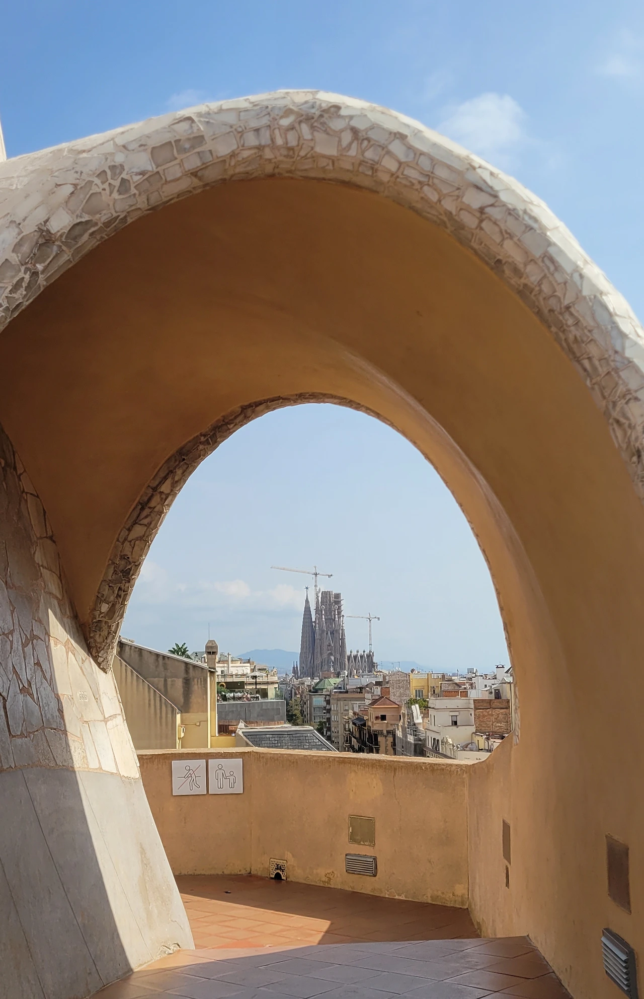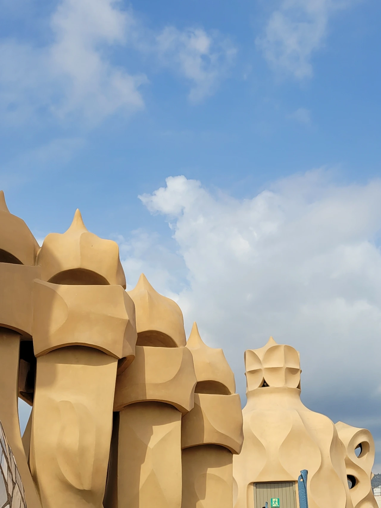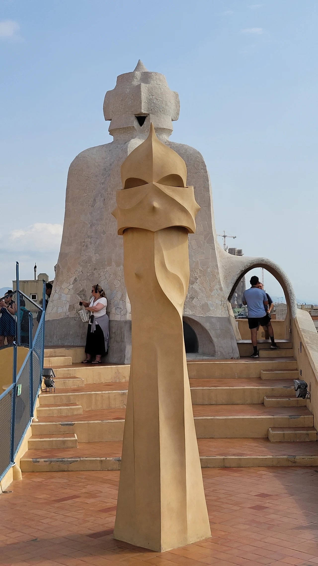 옥상에 들어서는 순간, 다양한 조형물들이 눈에 들어온다. 옥상도 다시 놀라운 세상이다. 가우디의 상상의 끝은 어디일까? 버섯 같기도 하고 거인처럼 보이기도 하고 철모를 쓴 로마 병사들도 보인다. 이 땅에 존재하지 않는 형상도 서있다. 모든 조각에도 곡선은 살아있다. 병사의 조각에는 투철하고 냉정한 전사의 굳은 기개도 느껴진다. 굴뚝을 이렇듯 기발하게 창조할 수 있다니 입이 다물어지지 않는다. 빙 돌아가며 둘러보는 데 볼 때마다 새로운 느낌이다. 굴뚝의 아치 사이로 보이는 풍경도 환상이다. 더구나 한쪽에서는 사그라다 파밀리아 성당도 보인다.