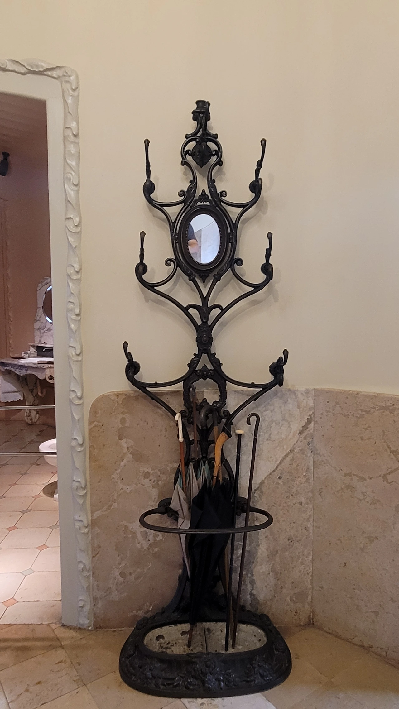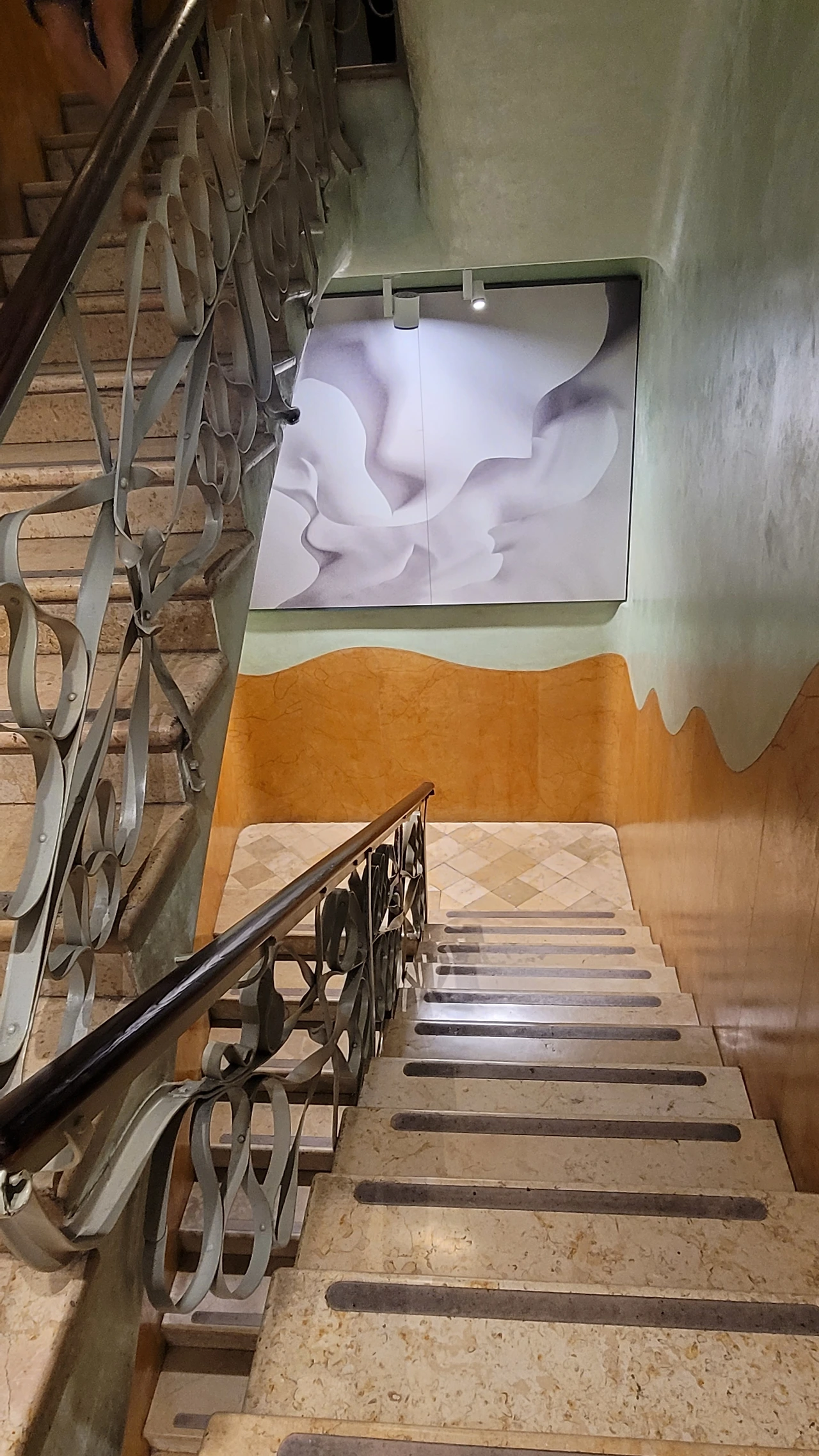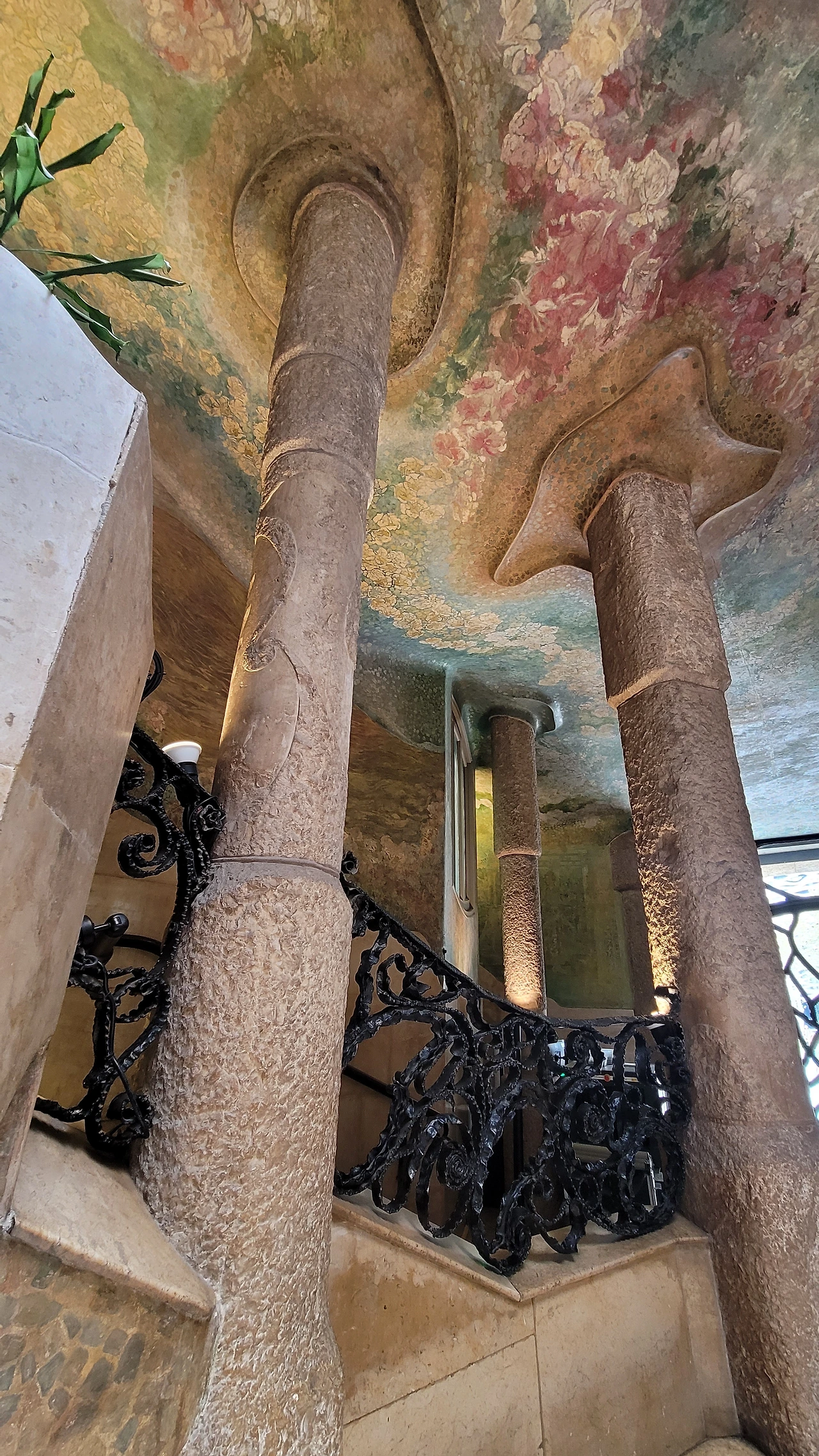 윗 층으로 올라가는 계단 난간의 철제 장식도 평범하지 않다. 자유로운 곡선의 장식이 이어져 있다. 벽면도 물결치듯 구분하여 색상을 칠해서 자유 분방한 느낌을 준다. 어디나 부드러운 곡선이 흘러넘친다.