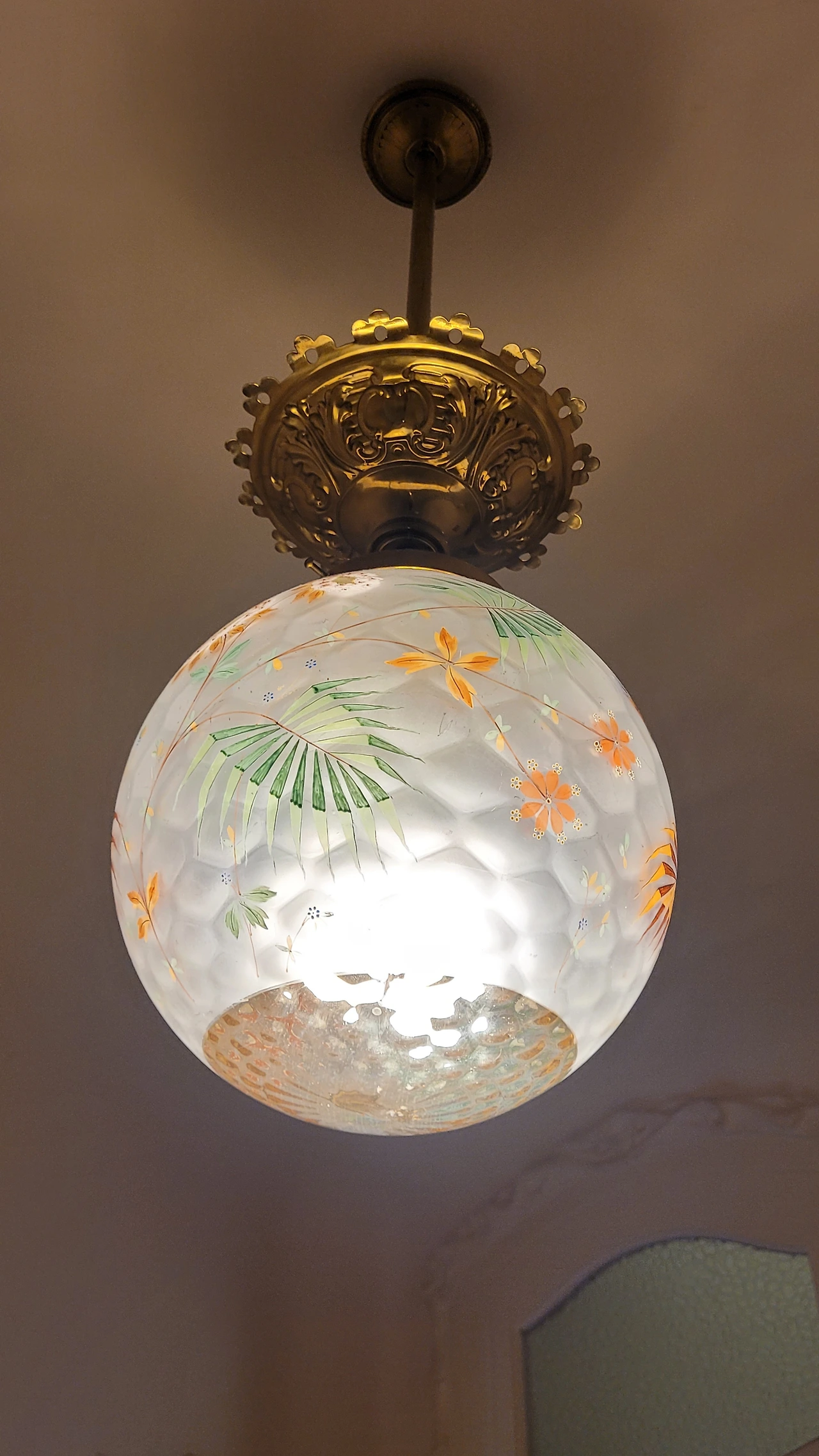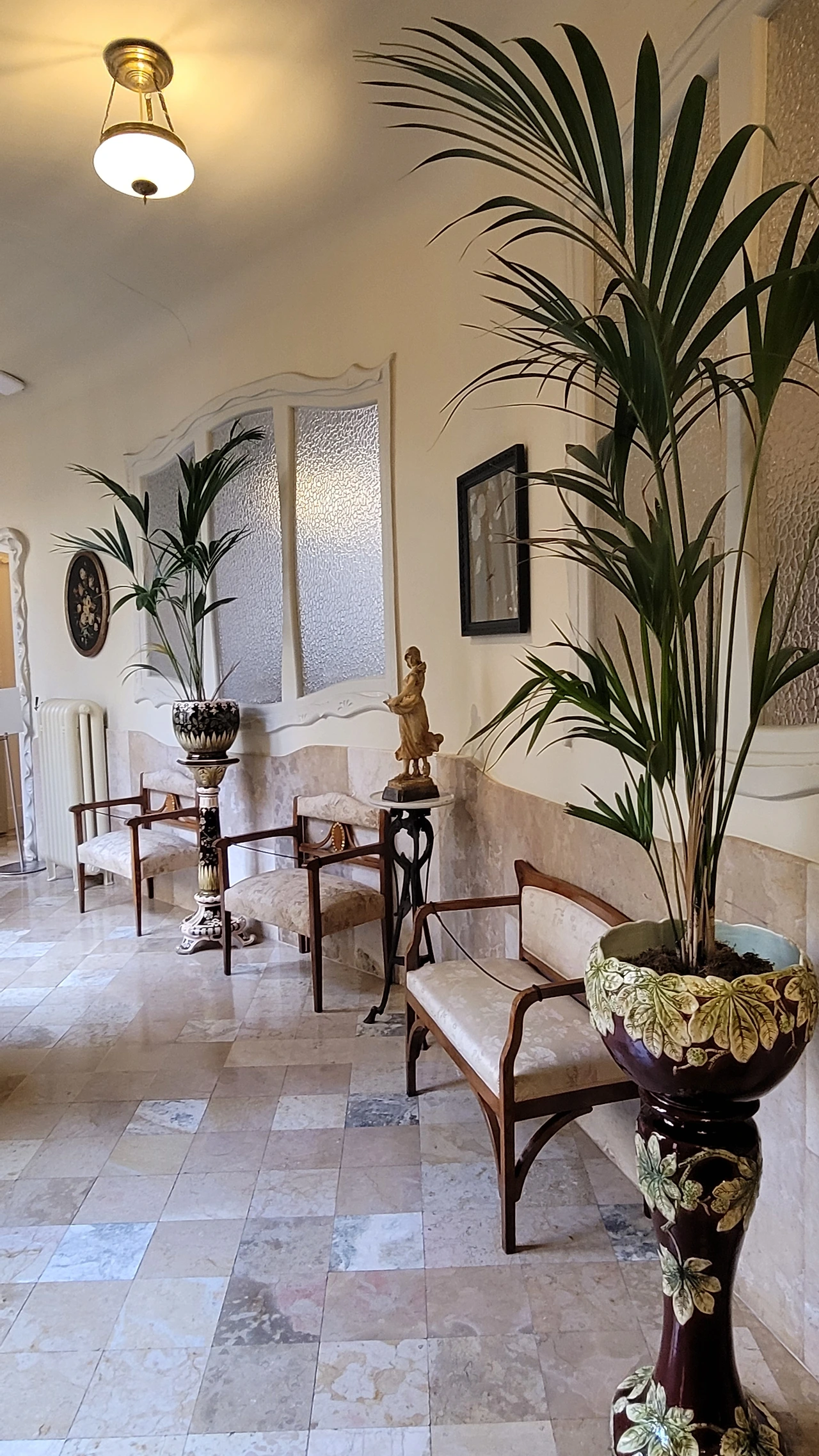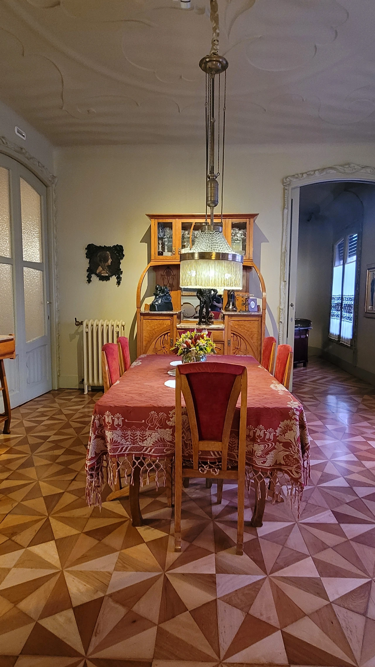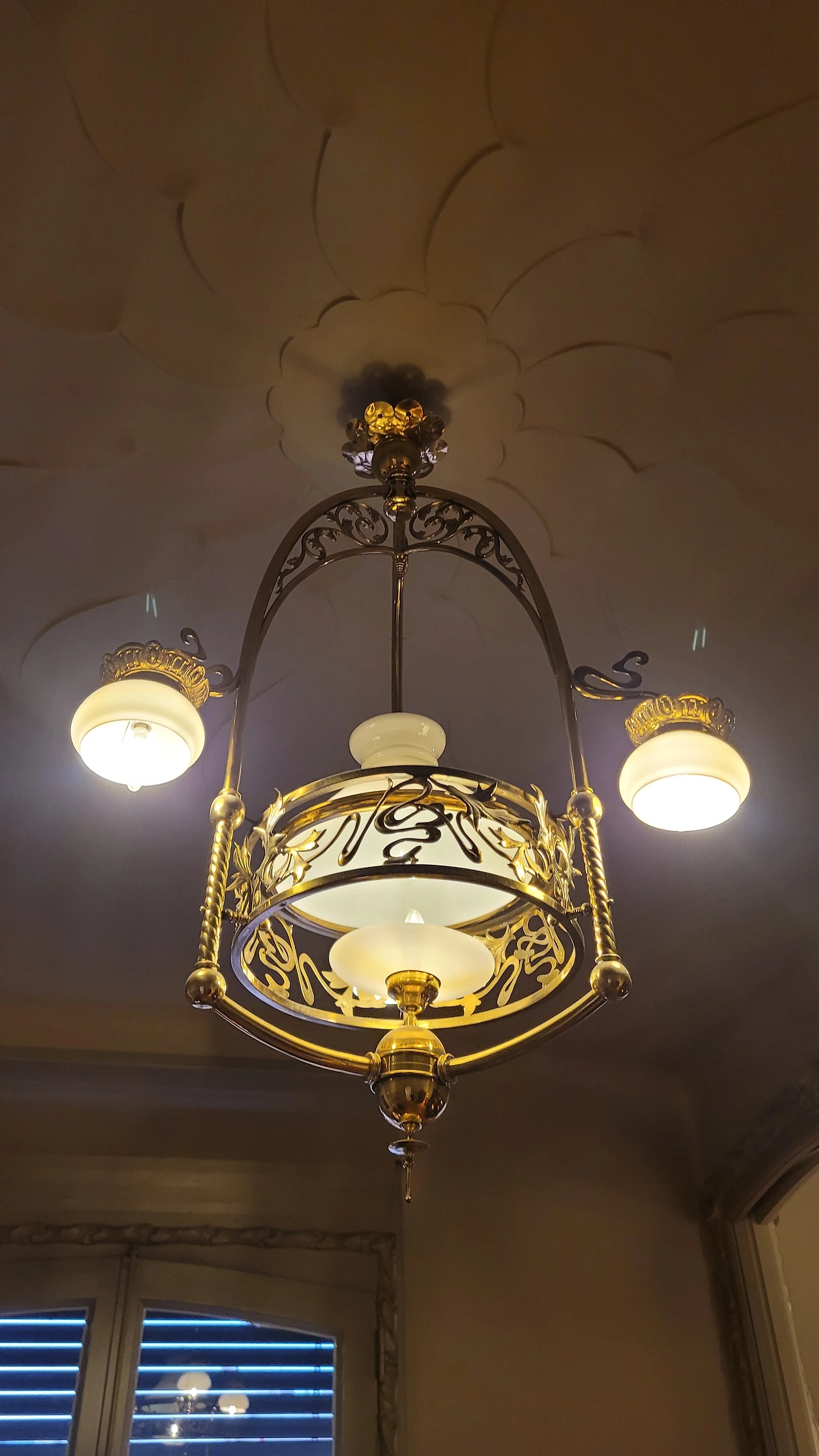 윗 층으로 올라가는 계단 난간의 철제 장식도 평범하지 않다. 자유로운 곡선의 장식이 이어져 있다. 벽면도 물결치듯 구분하여 색상을 칠해서 자유 분방한 느낌을 준다. 어디나 부드러운 곡선이 흘러넘친다.