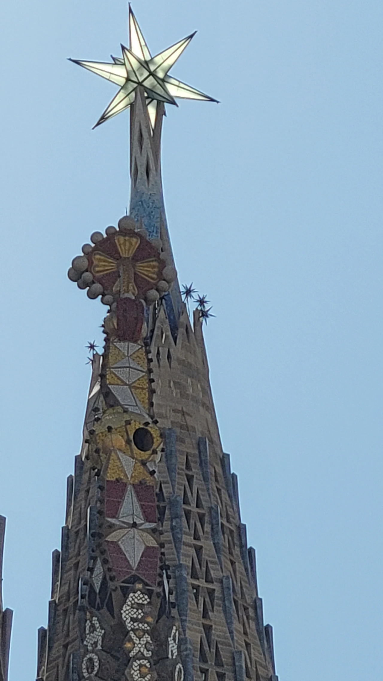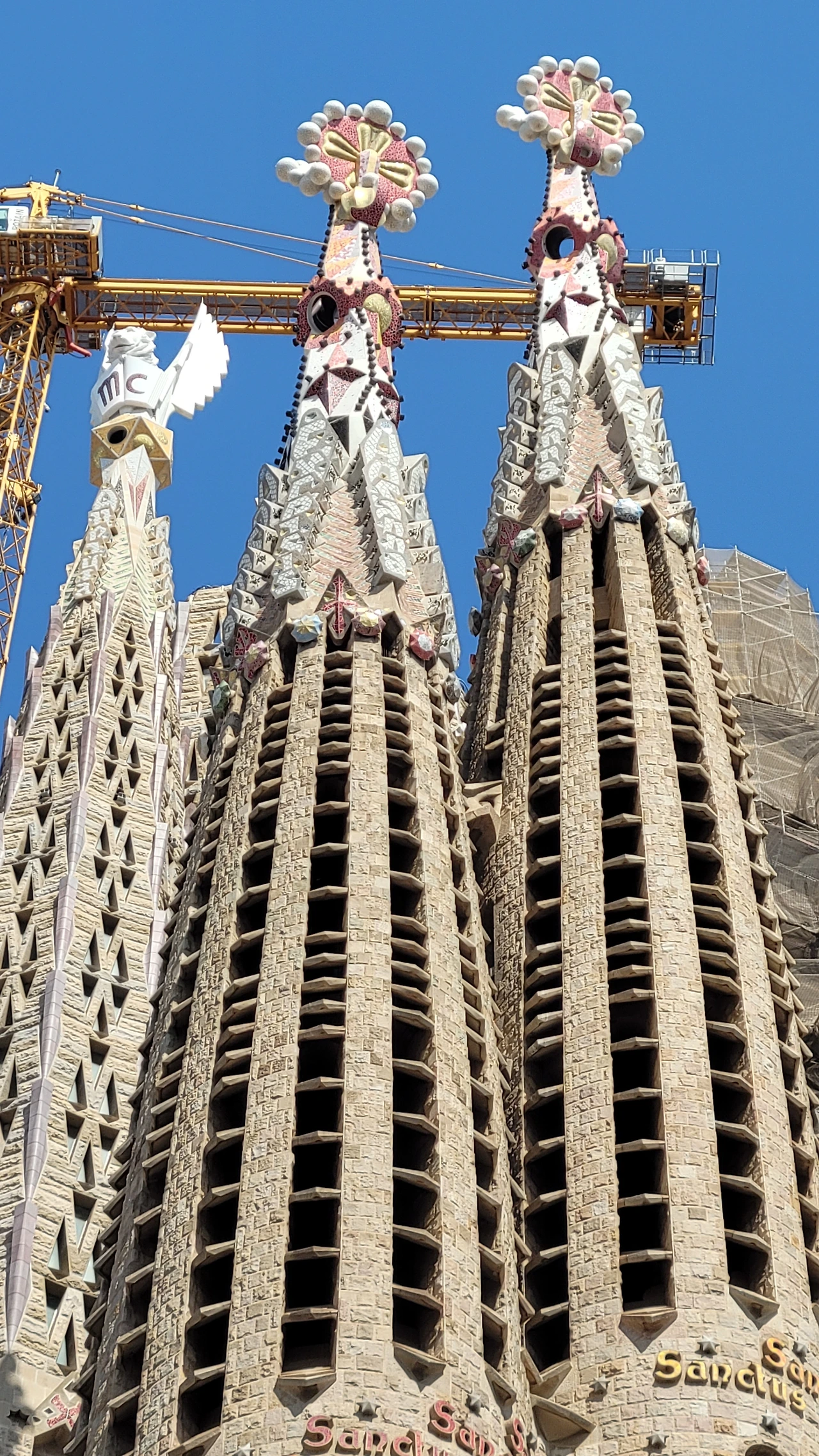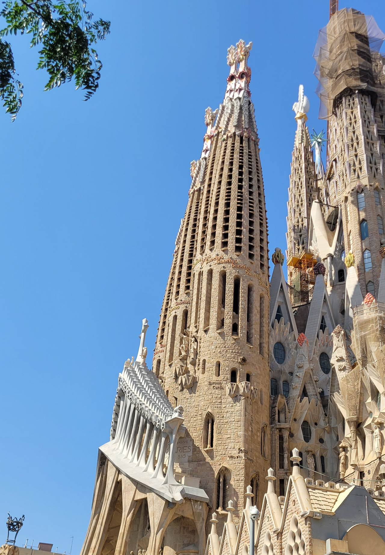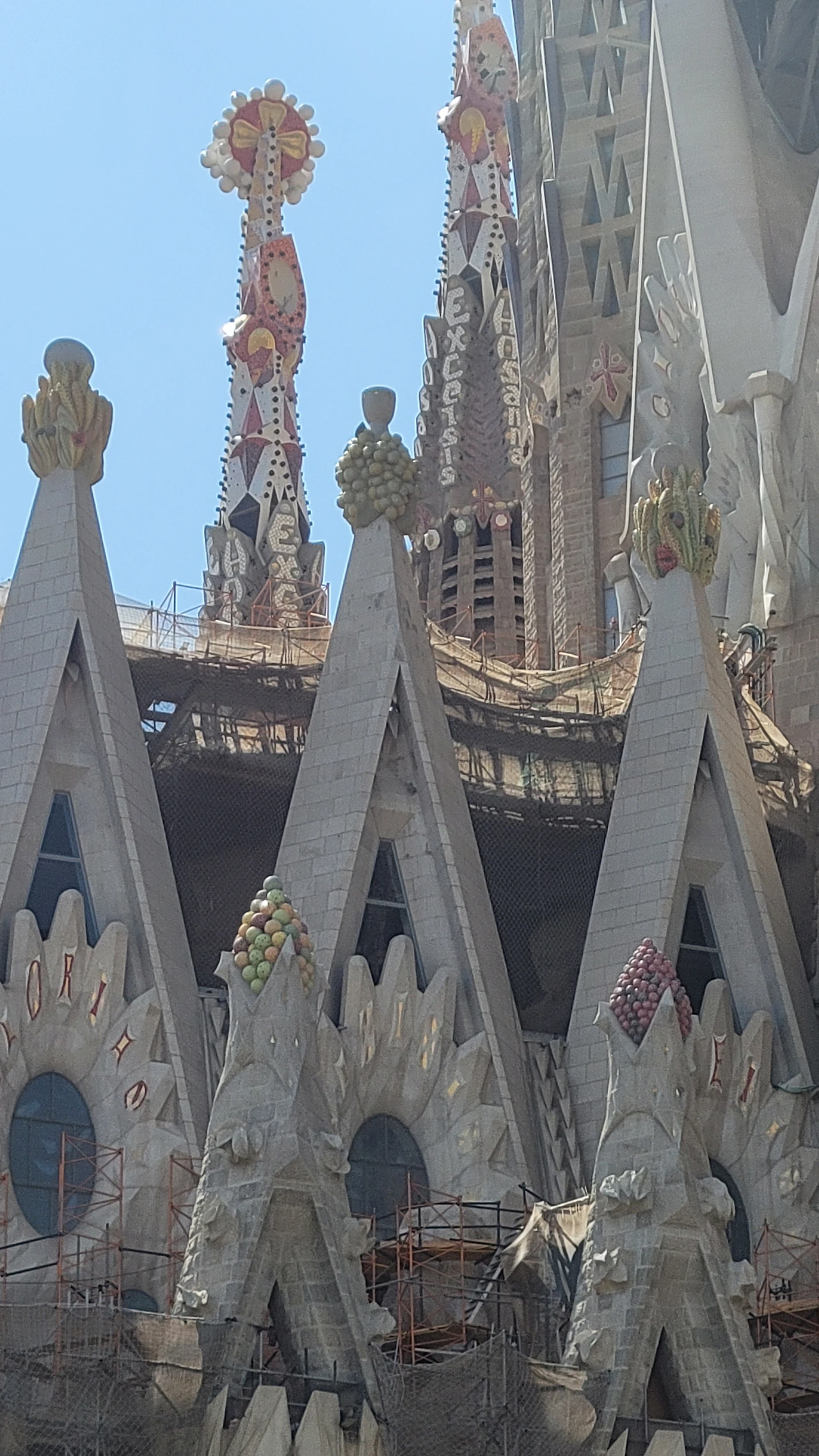 마지막 파사드인 영광의 파사드는 거의 완공되었다고 하는데 미공개로 아직은 볼 수 없다. 그곳이 주출입 통로가 되고 설계안으로는 너른 광장이 조성이 되어야 하는데 도로 건너편에 이미 건물이 빽빽하게 들어서서 만만치 않은 여정이 될 것 같다. 가이드의 안내에 따라 휴식 시간이 주어졌는데 보지 못한 방향을 마저 보려고 홀로 성당 주위를 돌았다. 면면이 독특한 구성으로 보면 볼수록 놀랍다. 연신 사진을 찍으며 아름다운 외관을 구경했다. 첨탑 꼭대기에는 과일들이 올려져 있는데 빈민들이 성당에 헌물 한 과일이나 야채들을 계절별로 구분하여 담아냈다고 전해진다.