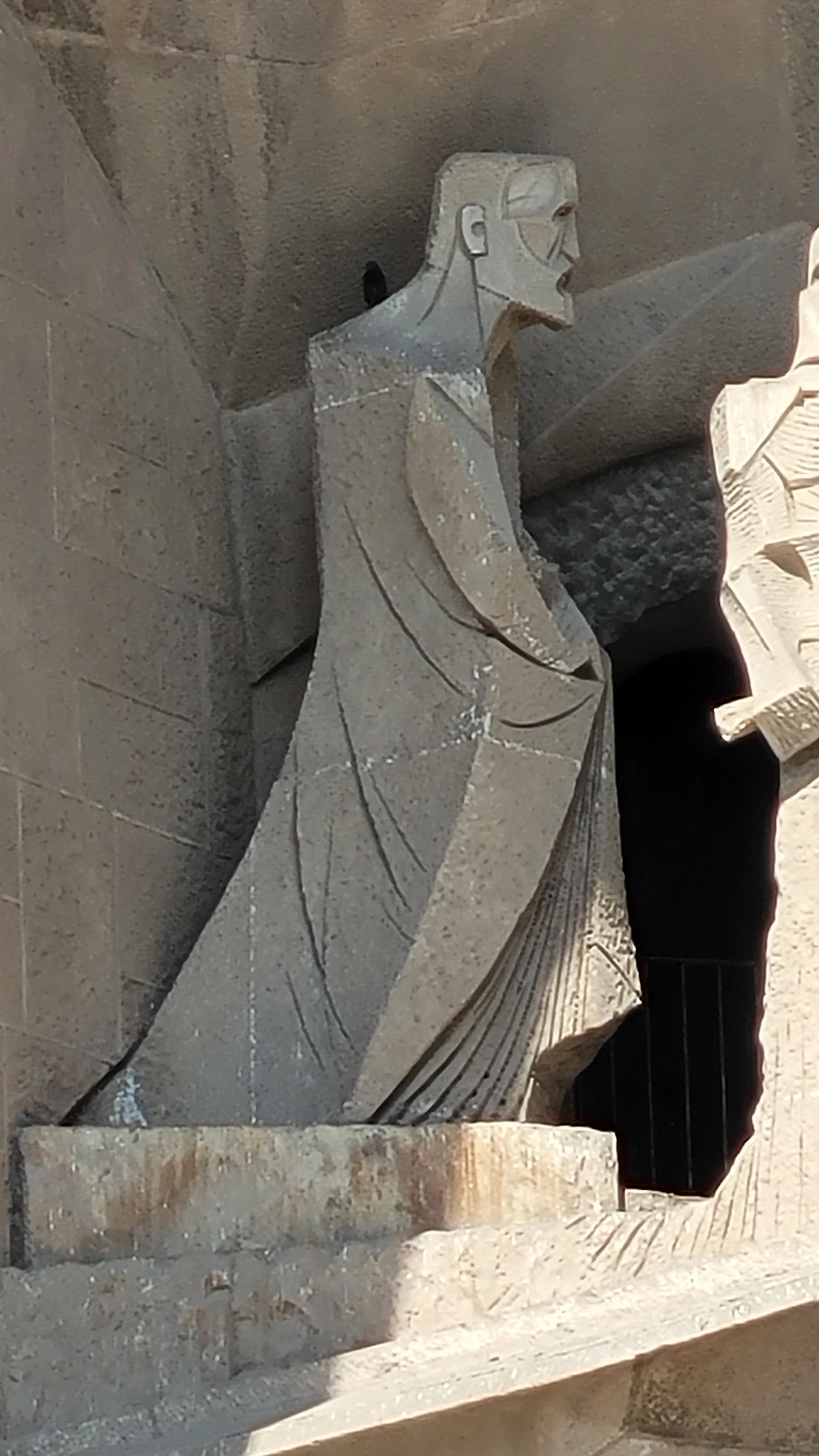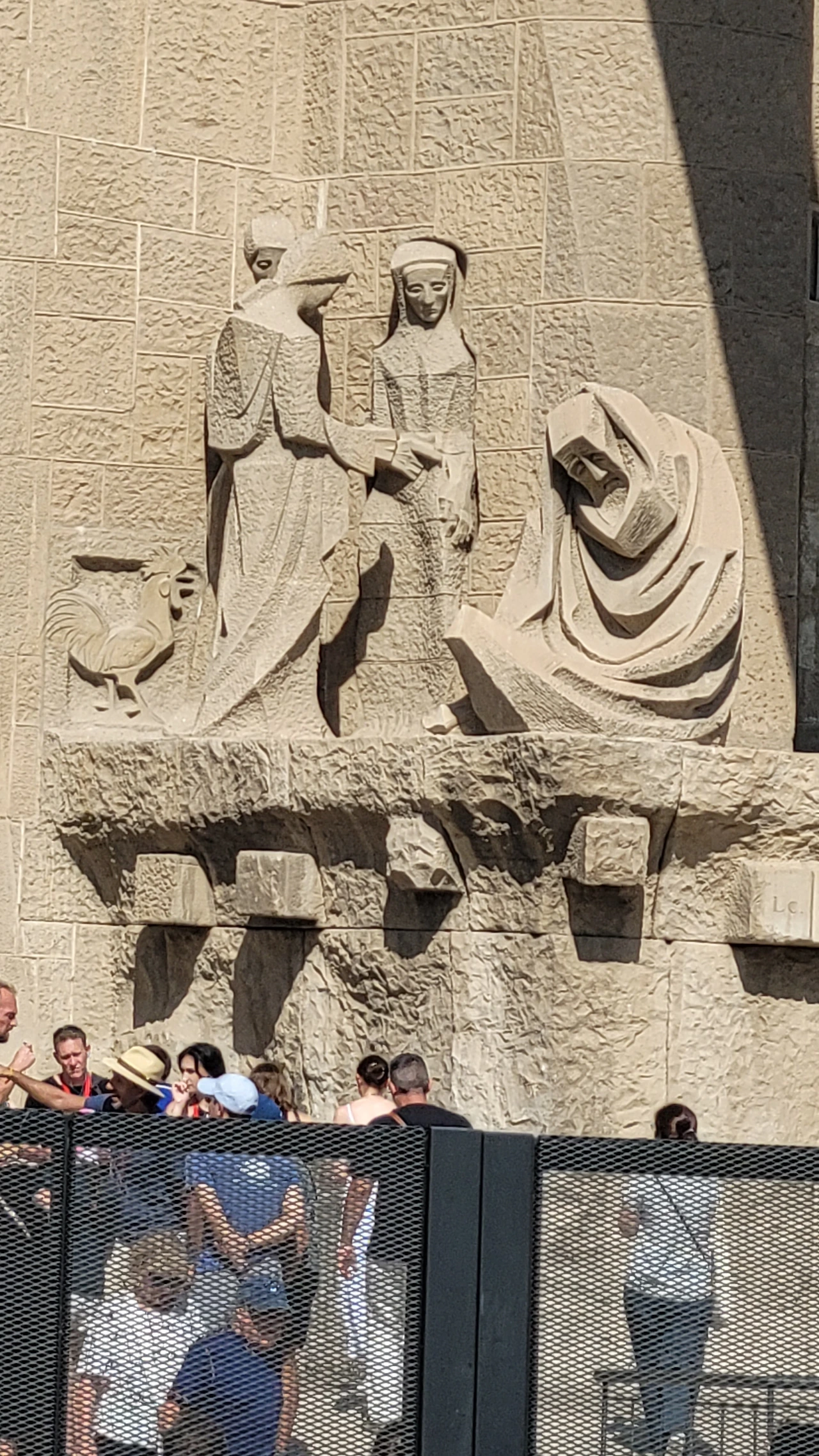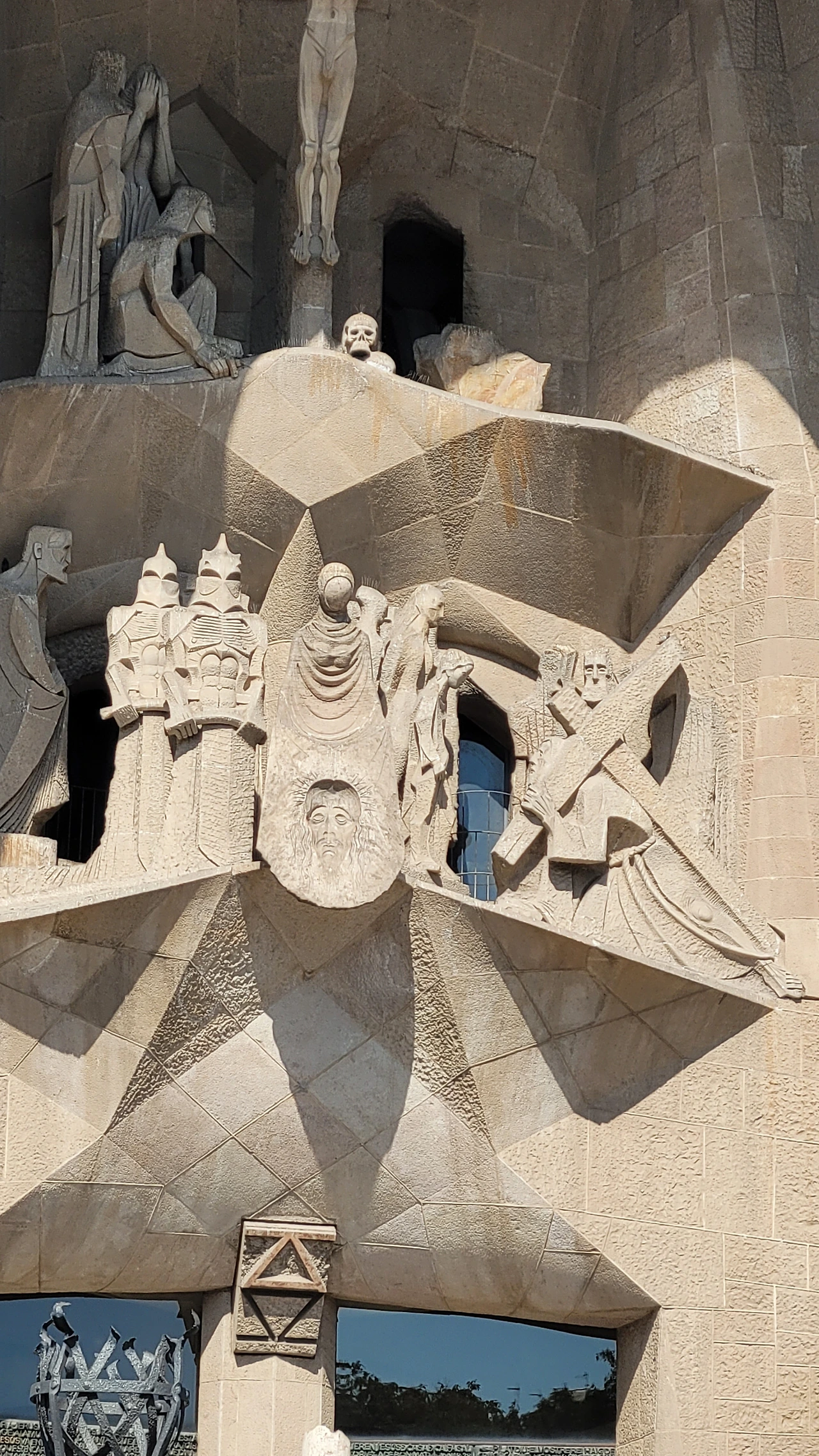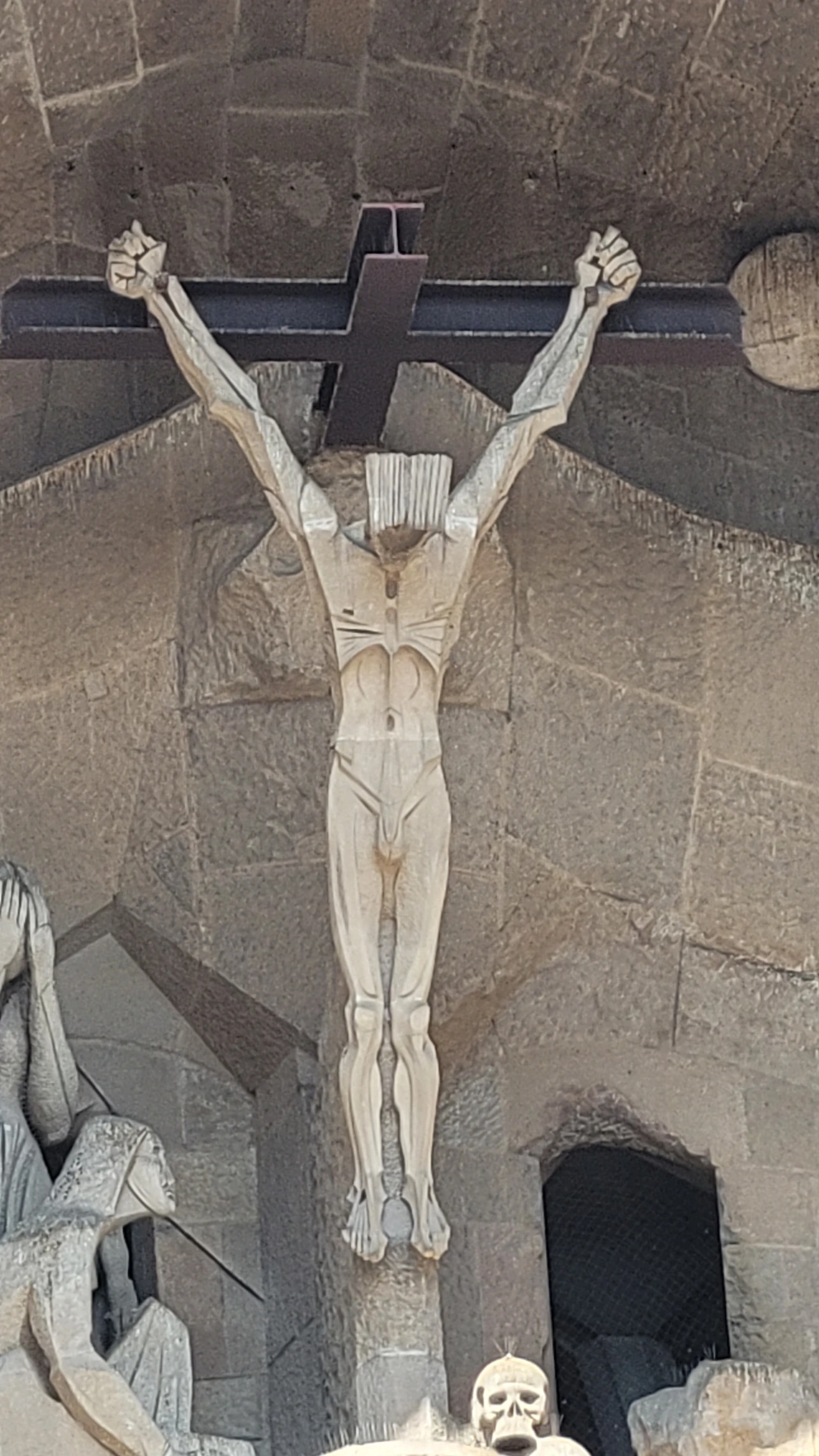 수난의 파사드는 가우디가 설계한 것을 수비라치라는 조각가가 완성을 했는 데 파격적인 조각으로 사람들에게 많은 비난을 받았다고 전해진다. 인체를 단순화하고 직선을 활용한 음각으로 추상에 가까운 면모를 보인다. 특히 십자가에 달린 예수상에 십자가는 건설에 사용되는 철근인 H빔이 쓰였고 예수님이 벌거벗은 모습으로 형상화해 성의 없다는 비판에 시달려야 했다. 사람들의 비난이 근거가 없는 것은 아닐지라도 그런 구상을 뛰어넘는 추상에 가까운 단순함이 주는 메시지가 강렬하게 사람들에게 각인이 되어 되려 예수님의 고난을 더욱 처절하게 표현해 냈다는 생각이 든다. 마방진과 숫자들이 많이 보이는 데 모두 다 깊은 의미를 담고 있다고 한다.