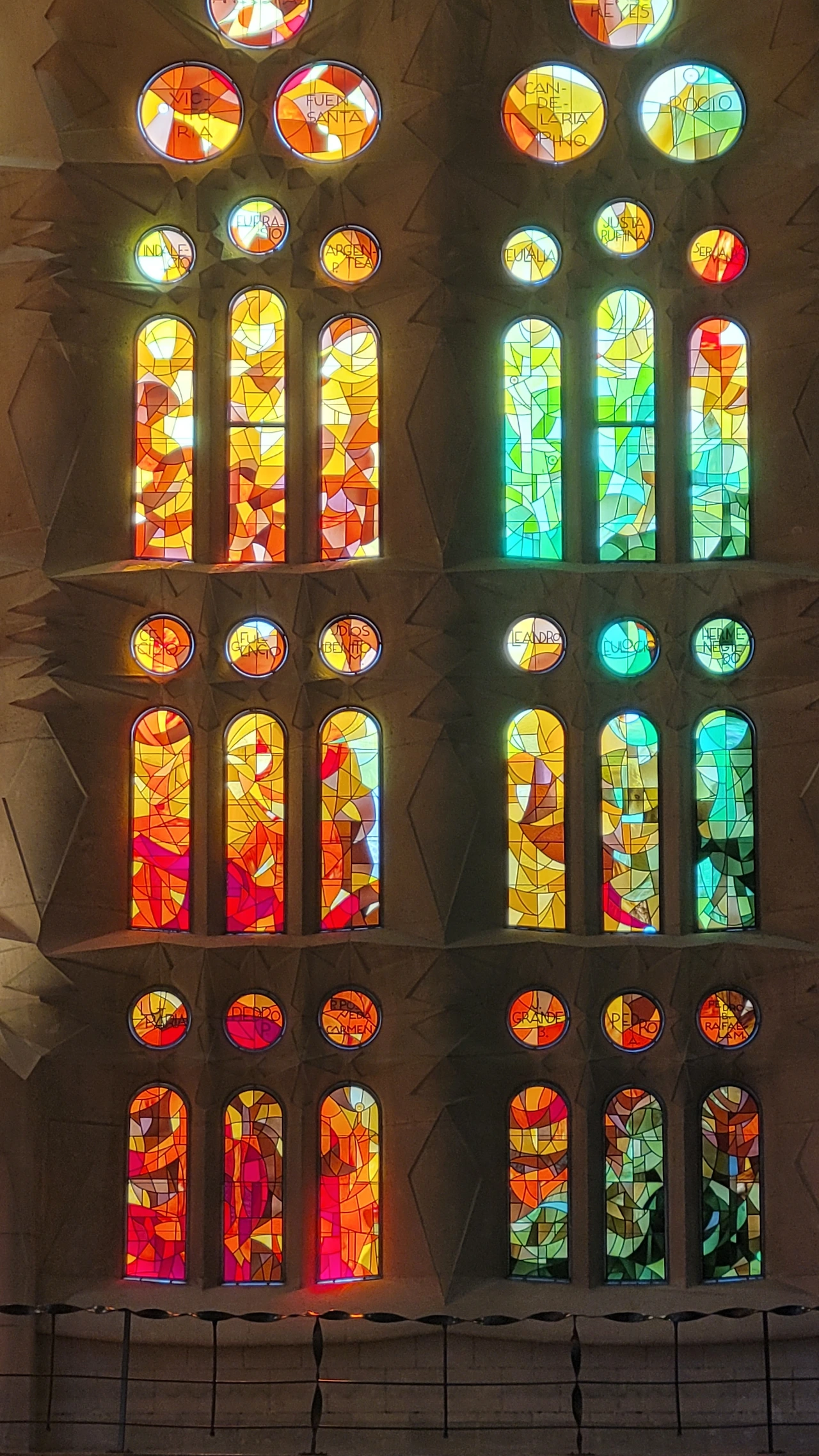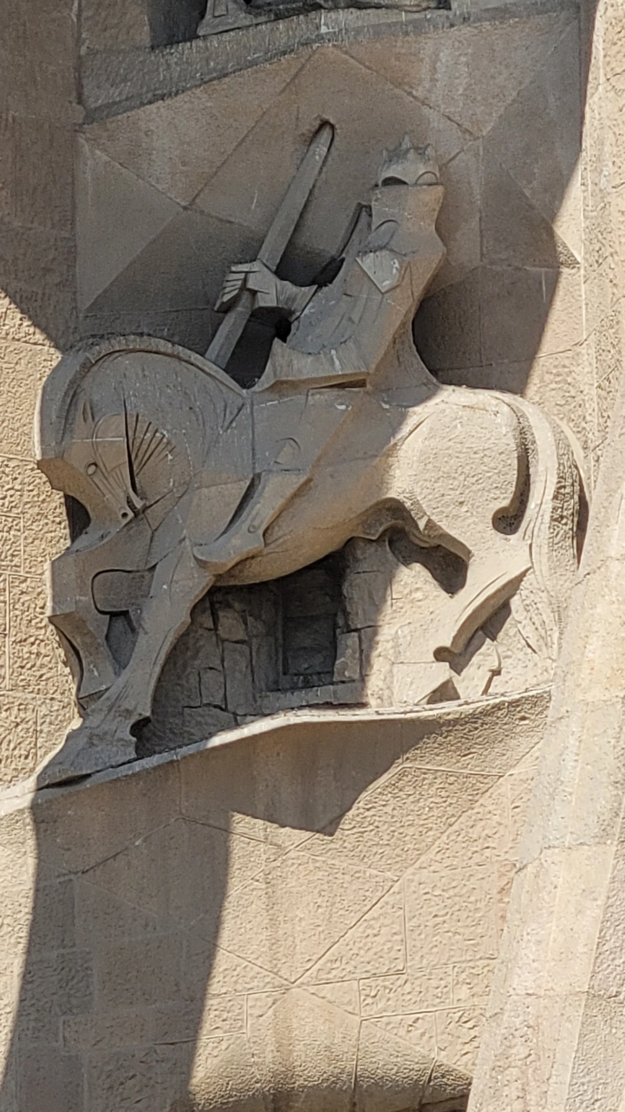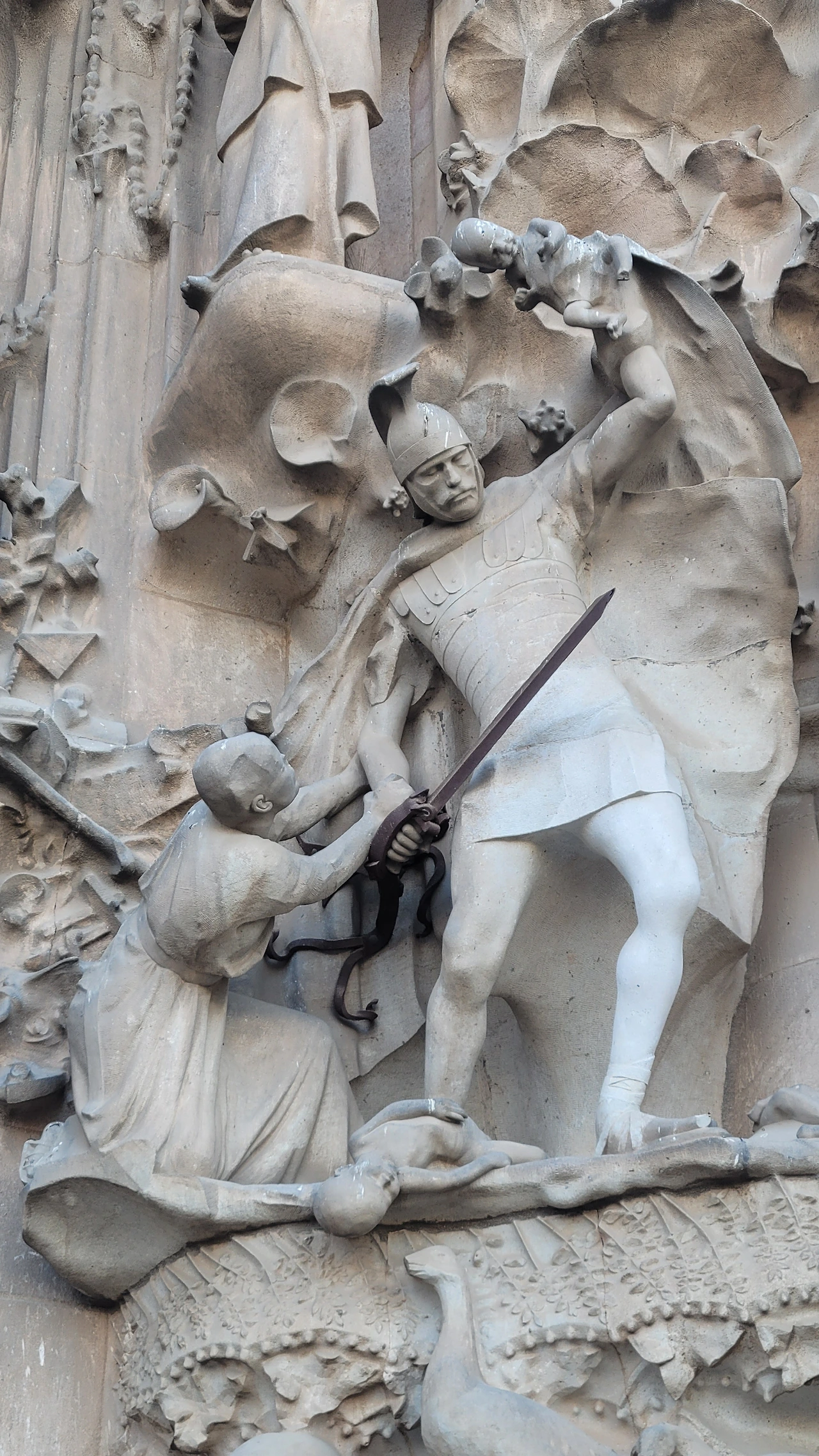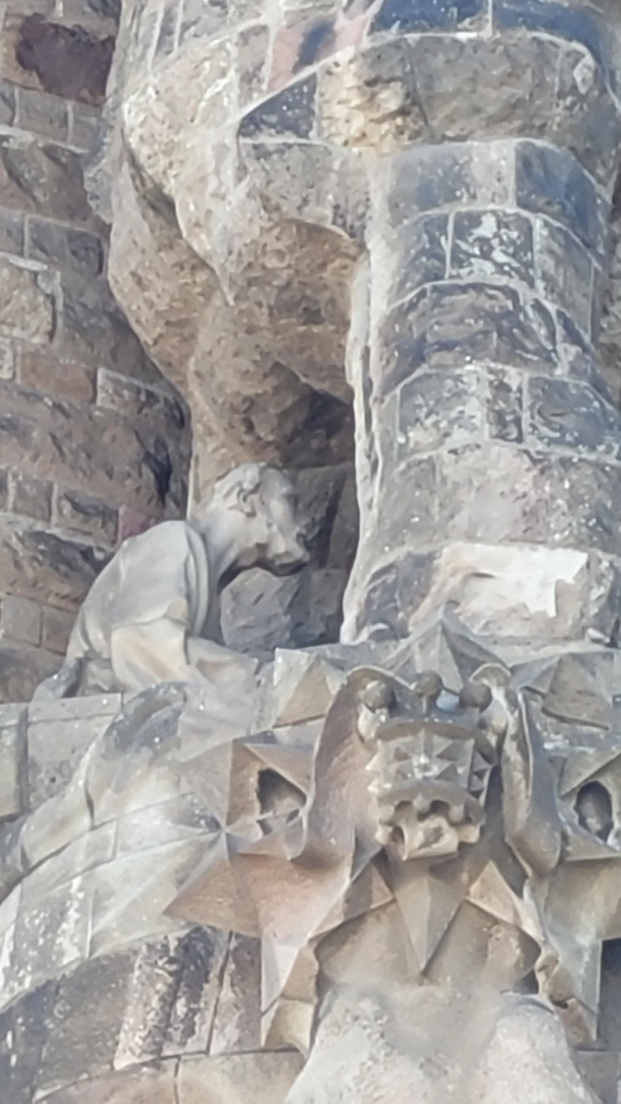 수난의 파사드는 가우디가 설계한 것을 수비라치라는 조각가가 완성을 했는 데 파격적인 조각으로 사람들에게 많은 비난을 받았다고 전해진다. 인체를 단순화하고 직선을 활용한 음각으로 추상에 가까운 면모를 보인다. 특히 십자가에 달린 예수상에 십자가는 건설에 사용되는 철근인 H빔이 쓰였고 예수님이 벌거벗은 모습으로 형상화해 성의 없다는 비판에 시달려야 했다. 사람들의 비난이 근거가 없는 것은 아닐지라도 그런 구상을 뛰어넘는 추상에 가까운 단순함이 주는 메시지가 강렬하게 사람들에게 각인이 되어 되려 예수님의 고난을 더욱 처절하게 표현해 냈다는 생각이 든다. 마방진과 숫자들이 많이 보이는 데 모두 다 깊은 의미를 담고 있다고 한다.
